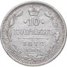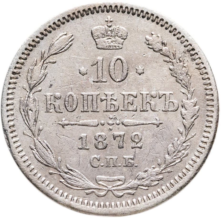В центре указан номинал - «10», ограниченный с обеих сторон шестиконечными звездочками. Над цифрой – Корона Российской империи. Под цифрой номинала — слово "КОПЕЕК". Ниже, расположен декоративный разделитель в виде двух разнонаправленных фигурных линий и стилизованным из точек крестом между ними. Под разделителем — дата выпуска монеты «1872». Под цифрой даты — обозначение монетного двора «С.П.Б.». Вдоль канта, не доходя до короны, изображен венок из лавровой и дубовой ветви, которые, в нижней части, перевязаны лентой на узел бантом. По окружности канта имеются рельефные элементы, выполненные в виде зубцов.