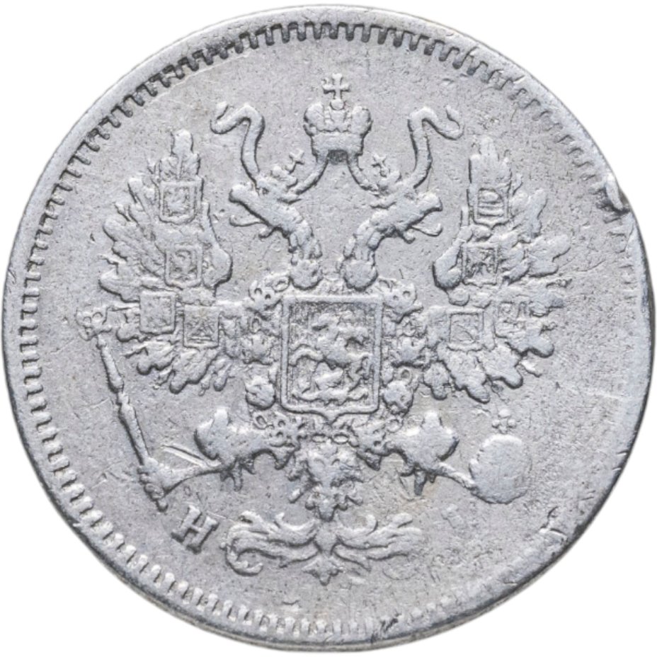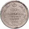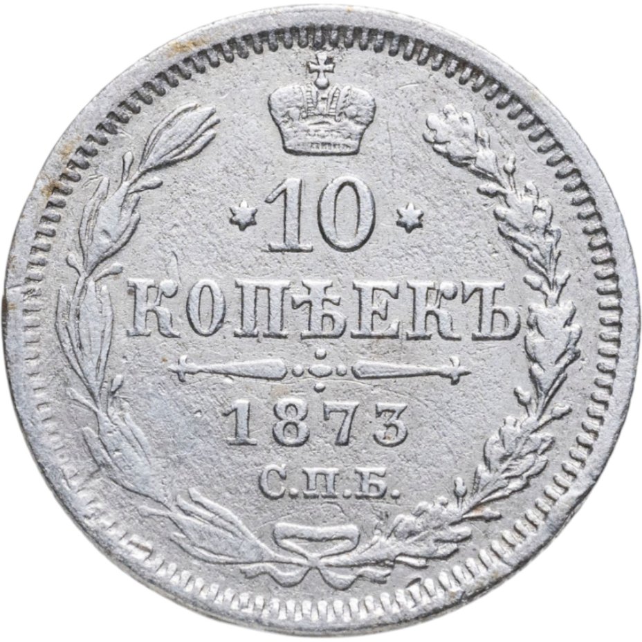 В центре указан номинал - «10», ограниченный с обеих сторон шестиконечными звездочками. Над цифрой – Корона Российской империи. Под цифрой номинала — слово "КОПЕЕК". Ниже, расположен декоративный разделитель в виде двух разнонаправленных фигурных линий и стилизованным из точек крестом между ними. Под разделителем — дата выпуска монеты «1873». Под цифрой даты — обозначение монетного двора «С.П.Б.». Вдоль канта, не доходя до короны, изображен венок из лавровой и дубовой ветви, которые, в нижней части, перевязаны лентой на узел бантом. По окружности канта имеются рельефные элементы, выполненные в виде зубцов.