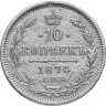 В центре указан номинал - «10», ограниченный с обеих сторон шестиконечными звездочками. Над цифрой – Корона Российской империи. Под цифрой номинала — слово "КОПЕЕК". Ниже, расположен декоративный разделитель в виде двух разнонаправленных фигурных линий и стилизованным из точек крестом между ними. Под разделителем — дата выпуска монеты «1874». Под цифрой даты — обозначение монетного двора «С.П.Б.». Вдоль канта, не доходя до короны, изображен венок из лавровой и дубовой ветви, которые, в нижней части, перевязаны лентой на узел бантом. По окружности канта имеются рельефные элементы, выполненные в виде зубцов.