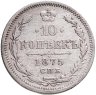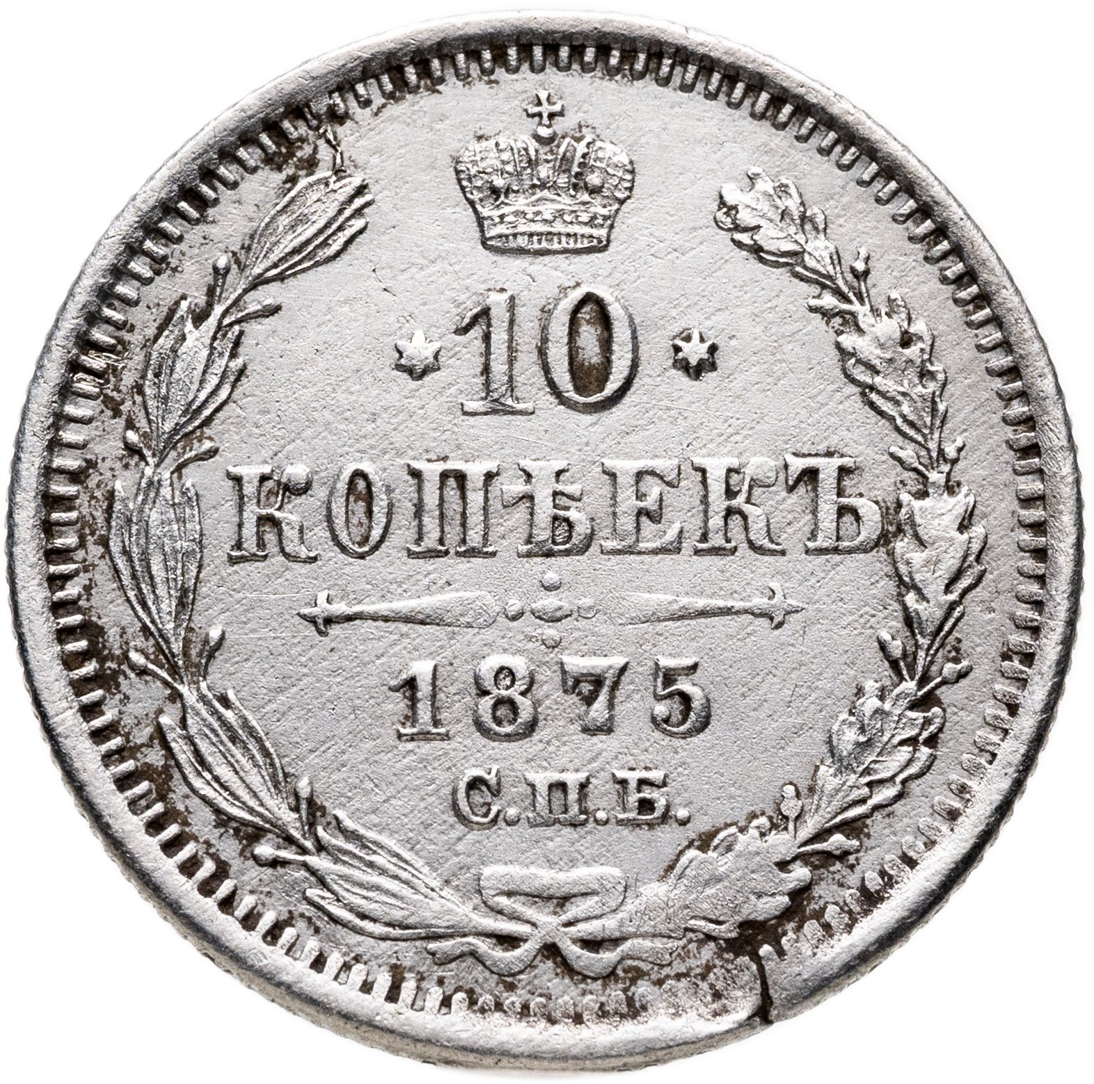 В центре указан номинал - «10», ограниченный с обеих сторон шестиконечными звездочками. Над цифрой – Корона Российской империи. Под цифрой номинала — слово "КОПЕЕК". Ниже, расположен декоративный разделитель в виде двух разнонаправленных фигурных линий и стилизованным из точек крестом между ними. Под разделителем — дата выпуска монеты «1875». Под цифрой даты — обозначение монетного двора «С.П.Б.». Вдоль канта, не доходя до короны, изображен венок из лавровой и дубовой ветви, которые, в нижней части, перевязаны лентой на узел бантом. По окружности канта имеются рельефные элементы, выполненные в виде зубцов.