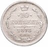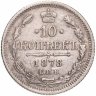 В центре указан номинал - «10», ограниченный с обеих сторон шестиконечными звездочками. Над цифрой – Корона Российской империи. Под цифрой номинала — слово "КОПЕЕК". Ниже, расположен декоративный разделитель в виде двух разнонаправленных фигурных линий и стилизованным из точек крестом между ними. Под разделителем — дата выпуска монеты «1878». Под цифрой даты — обозначение монетного двора «С.П.Б.». Вдоль канта, не доходя до короны, изображен венок из лавровой и дубовой ветви, которые, в нижней части, перевязаны лентой на узел бантом. По окружности канта имеются рельефные элементы, выполненные в виде зубцов.