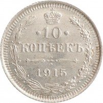 В центре указан номинал «10», ограниченный с обеих сторон звездочками. Над цифрой – Корона Российской империи. Под цифрой номинала — слово "КОПЕЕК". Ниже, расположен декоративный разделитель в виде двух разнонаправленных фигурных линий и стилизованным из точек крестом между ними. Под разделителем — дата выпуска монеты «1915». Вдоль канта, не доходя до короны, изображен венок из лавровой и дубовой ветви, которые в нижней части перевязаны лентой на узел бантом. По окружности канта имеются рельефные элементы, выполненные в виде зубцов.