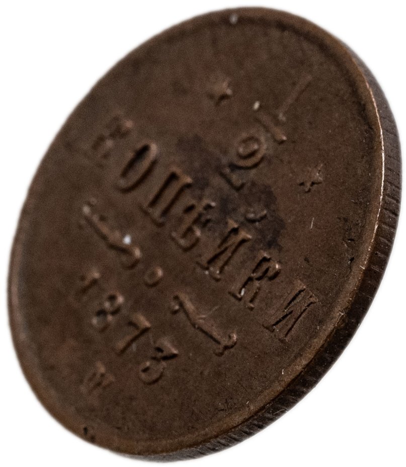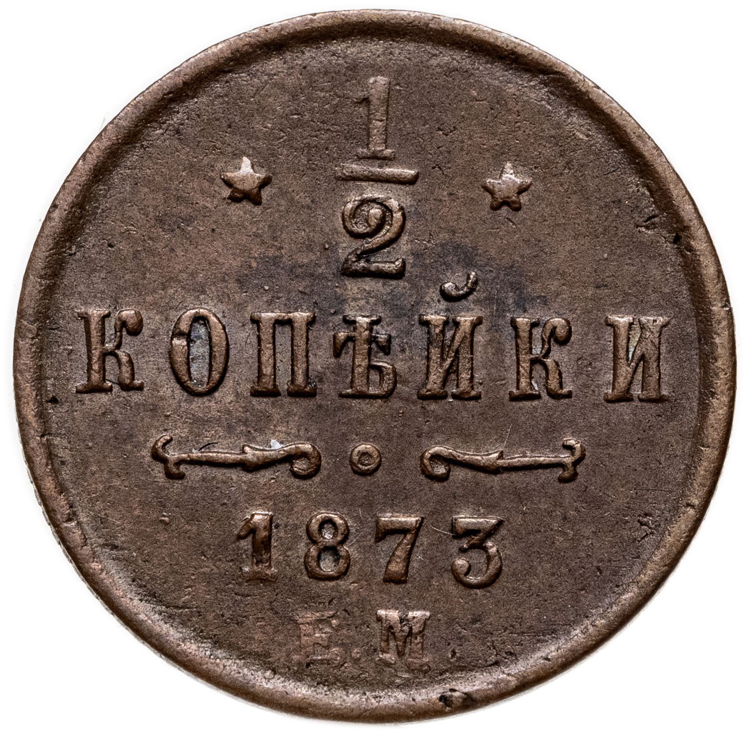 В центре указан номинал «1/2», ограниченный с обеих сторон звездочками. Под цифрой номинала слово — "КОПЕЙКИ". Ниже, расположен декоративный разделитель в виде двух изогнутых линий и небольшой окружности между ними. Под линиями год выпуска монеты "1873" и под ним обозначение монетного двора «Е.М.».