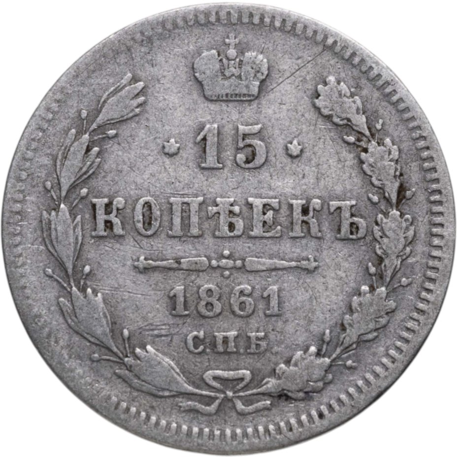 В центре указан номинал «15», ограниченный с обеих сторон шестиконечными звездочками. Над цифрой – Корона Российской империи. Под цифрой номинала — слово "КОПЕЕК". Ниже, расположен декоративный разделитель в виде двух разнонаправленных фигурных линий и стилизованным из точек крестом между ними. Под разделителем — дата выпуска монеты «1861». Под цифрой даты — обозначение монетного двора «С.П.Б.». Вдоль канта, не доходя до короны, изображен венок из лавровой и дубовой ветви, которые в нижней части перевязаны лентой на узел бантом. По окружности канта имеются рельефные элементы, выполненные в виде зубцов.