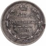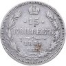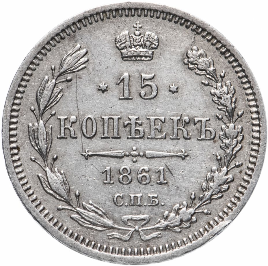 В центре указан номинал «15», ограниченный с обеих сторон шестиконечными звездочками. Над цифрой – Корона Российской империи. Под цифрой номинала — слово "КОПЕЕК". Ниже, расположен декоративный разделитель в виде двух разнонаправленных фигурных линий и стилизованным из точек крестом между ними. Под разделителем — дата выпуска монеты «1861». Под цифрой даты — обозначение монетного двора «С.П.Б.». Вдоль канта, не доходя до короны, изображен венок из лавровой и дубовой ветви, которые в нижней части перевязаны лентой на узел бантом. По окружности канта имеются рельефные элементы, выполненные в виде зубцов.