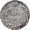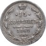 В центре указан номинал «15», ограниченный с обеих сторон шестиконечными звездочками. Над цифрой – Корона Российской империи. Под цифрой номинала — слово "КОПЕЕК". Ниже, расположен декоративный разделитель в виде двух разнонаправленных фигурных линий и стилизованным из точек крестом между ними. Под разделителем — дата выпуска монеты «1862». Под цифрой даты — обозначение монетного двора «С.П.Б.». Вдоль канта, не доходя до короны, изображен венок из лавровой и дубовой ветви, которые в нижней части перевязаны лентой на узел бантом. По окружности канта имеются рельефные элементы, выполненные в виде зубцов.