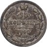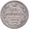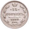 В центре указан номинал «15», ограниченный с обеих сторон шестиконечными звездочками. Над цифрой – Корона Российской империи. Под цифрой номинала — слово "КОПЕЕК". Ниже, расположен декоративный разделитель в виде двух разнонаправленных фигурных линий и стилизованным из точек крестом между ними. Под разделителем — дата выпуска монеты «1862». Под цифрой даты — обозначение монетного двора «С.П.Б.». Вдоль канта, не доходя до короны, изображен венок из лавровой и дубовой ветви, которые в нижней части перевязаны лентой на узел бантом. По окружности канта имеются рельефные элементы, выполненные в виде зубцов.