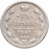 В центре указан номинал - «15», ограниченный с обеих сторон шестиконечными звездочками. Над цифрой – Корона Российской империи. Под цифрой номинала — слово "КОПЕЕК". Ниже, расположен декоративный разделитель в виде двух разнонаправленных фигурных линий и стилизованным из точек крестом между ними. Под разделителем — дата выпуска монеты «1868». Под цифрой даты — обозначение монетного двора «С.П.Б.». Вдоль канта, не доходя до короны, изображен венок из лавровой и дубовой ветви, которые, в нижней части, перевязаны лентой на узел бантом. По окружности канта имеются рельефные элементы, выполненные в виде зубцов.