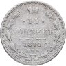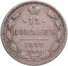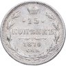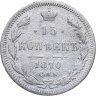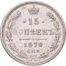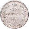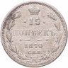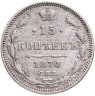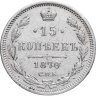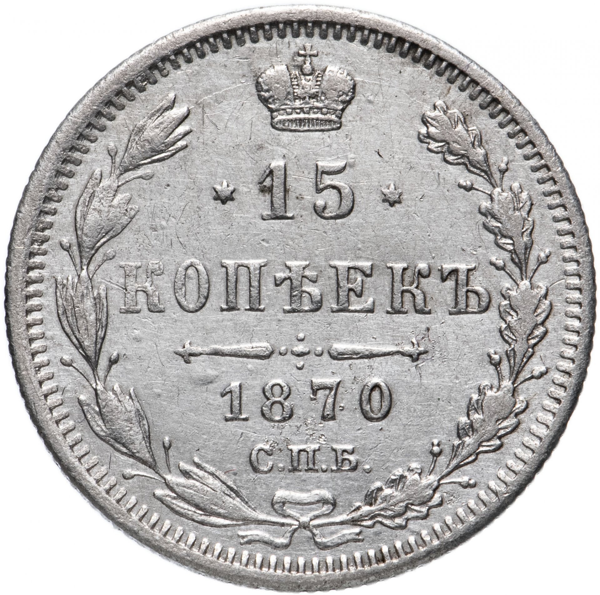 В центре указан номинал - «15», ограниченный с обеих сторон шестиконечными звездочками. Над цифрой – Корона Российской империи. Под цифрой номинала — слово "КОПЕЕК". Ниже, расположен декоративный разделитель в виде двух разнонаправленных фигурных линий и стилизованным из точек крестом между ними. Под разделителем — дата выпуска монеты «1870». Под цифрой даты — обозначение монетного двора «С.П.Б.». Вдоль канта, не доходя до короны, изображен венок из лавровой и дубовой ветви, которые, в нижней части, перевязаны лентой на узел бантом. По окружности канта имеются рельефные элементы, выполненные в виде зубцов.