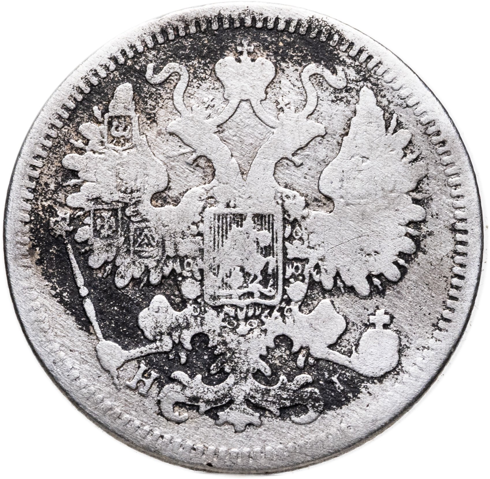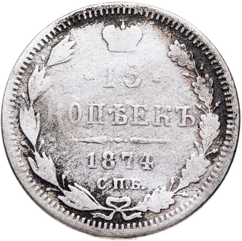 В центре указан номинал - «15», ограниченный с обеих сторон шестиконечными звездочками. Над цифрой – Корона Российской империи. Под цифрой номинала — слово "КОПЕЕК". Ниже, расположен декоративный разделитель в виде двух разнонаправленных фигурных линий и стилизованным из точек крестом между ними. Под разделителем — дата выпуска монеты «1874». Под цифрой даты — обозначение монетного двора «С.П.Б.». Вдоль канта, не доходя до короны, изображен венок из лавровой и дубовой ветви, которые, в нижней части, перевязаны лентой на узел бантом. По окружности канта имеются рельефные элементы, выполненные в виде зубцов.