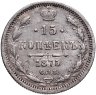 В центре указан номинал - «15», ограниченный с обеих сторон шестиконечными звездочками. Над цифрой – Корона Российской империи. Под цифрой номинала — слово "КОПЕЕК". Ниже, расположен декоративный разделитель в виде двух разнонаправленных фигурных линий и стилизованным из точек крестом между ними. Под разделителем — дата выпуска монеты «1875». Под цифрой даты — обозначение монетного двора «С.П.Б.». Вдоль канта, не доходя до короны, изображен венок из лавровой и дубовой ветви, которые, в нижней части, перевязаны лентой на узел бантом. По окружности канта имеются рельефные элементы, выполненные в виде зубцов.