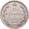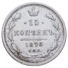 В центре указан номинал - «15», ограниченный с обеих сторон шестиконечными звездочками. Над цифрой – Корона Российской империи. Под цифрой номинала — слово "КОПЕЕК". Ниже, расположен декоративный разделитель в виде двух разнонаправленных фигурных линий и стилизованным из точек крестом между ними. Под разделителем — дата выпуска монеты «1876». Под цифрой даты — обозначение монетного двора «С.П.Б.». Вдоль канта, не доходя до короны, изображен венок из лавровой и дубовой ветви, которые, в нижней части, перевязаны лентой на узел бантом. По окружности канта имеются рельефные элементы, выполненные в виде зубцов.