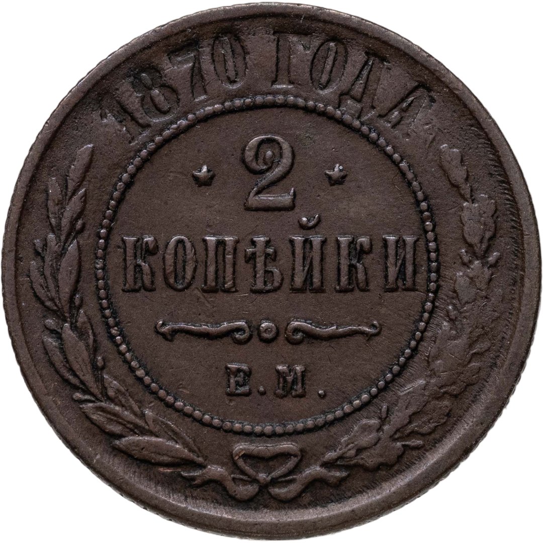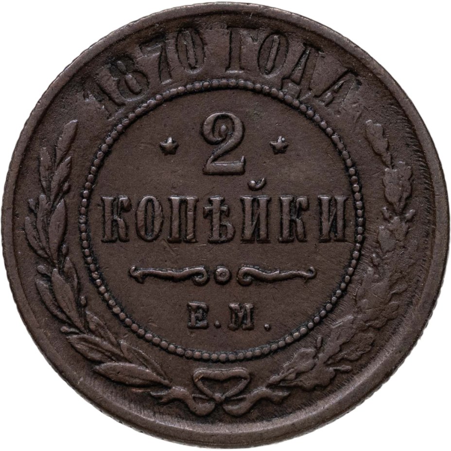 В центре указан номинал «2», ограниченный с обеих сторон звездочками. Под цифрой номинала слово — "КОПЕЙКИ". Ниже, расположен декоративный разделитель в виде двух изогнутых линий и небольшой окружности между ними. Под линиями обозначение монетного двора «Е.М.». Центральная часть отделена от остального изображения, окружностью в виде точек. В верхней части по кругу углубленная надпись: "1870 ГОДА". Ниже этой надписи, вдоль канта, изображен венок из лавровой и дубовой ветви, которые в нижней части перевязаны лентой на узел бантом.