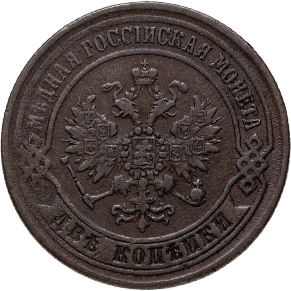 В центре монеты изображен Малый Государственный Герб Российской империи - двуглавый орел, головы которого увенчаны двумя коронами, третья, большая корона над ними. Все они соединены лентой Андрея Первозванного. В правой лапе орла – скипетр, в левой – держава. На его груди расположен Московский герб, в щите изображен Георгий Победоносец с копьем поражающий дракона. Вокруг щита цепь ордена Св. Апостола Андрея Первозванного. На крыльях орла изображены гербы: Царства Казанского, Польского, Херсонеса Таврического, Астраханского, Сибирского, Грузинского и герб соединенных княжеств Киевского, Новгородского и Владимирского — по 4 на каждое крыло. По окружности - две полукруглые плашки, соединенные узорами. На верхней плашке выпуклая надпись: "МЕДНАЯ РОССИЙСКАЯ МОНЕТА". На нижней плашке, изображенной в виде ленты, углубленная надпись: "ДВЕ КОПЕЙКИ".
