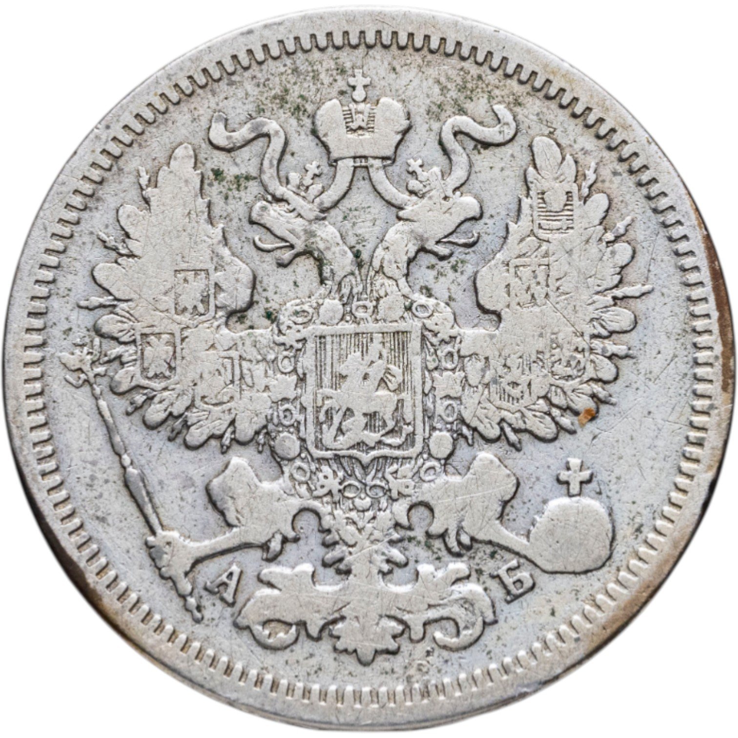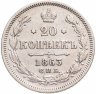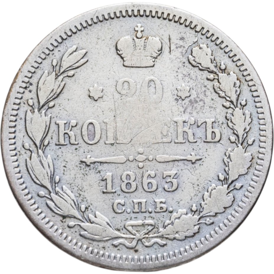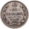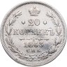 В центре указан номинал «20», ограниченный с обеих сторон шестиконечными звездочками. Над цифрой – Корона Российской империи. Под цифрой номинала — слово "КОПЕЕК". Ниже, расположен декоративный разделитель в виде двух разнонаправленных фигурных линий и стилизованным из точек крестом между ними. Под разделителем — дата выпуска монеты «1863». Под цифрой даты — обозначение монетного двора «С.П.Б.». Вдоль канта, не доходя до короны, изображен венок из лавровой и дубовой ветви, которые в нижней части перевязаны лентой на узел бантом. По окружности канта имеются рельефные элементы, выполненные в виде зубцов.