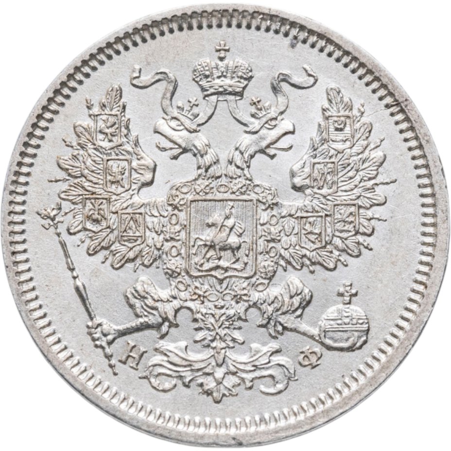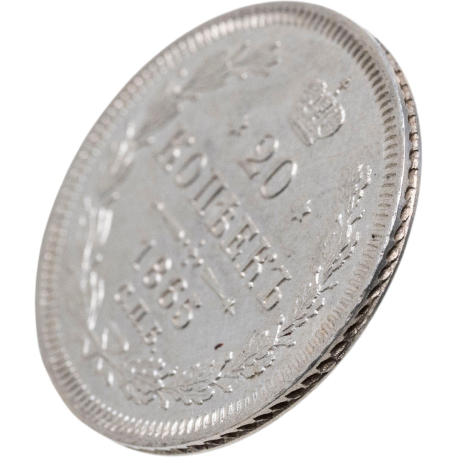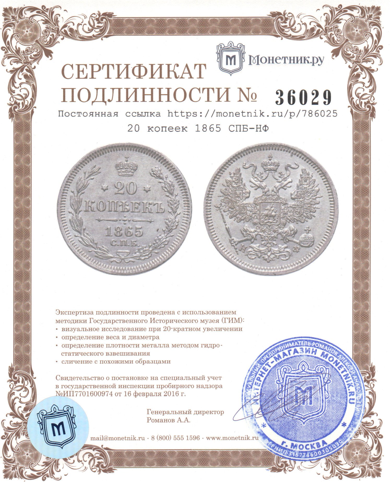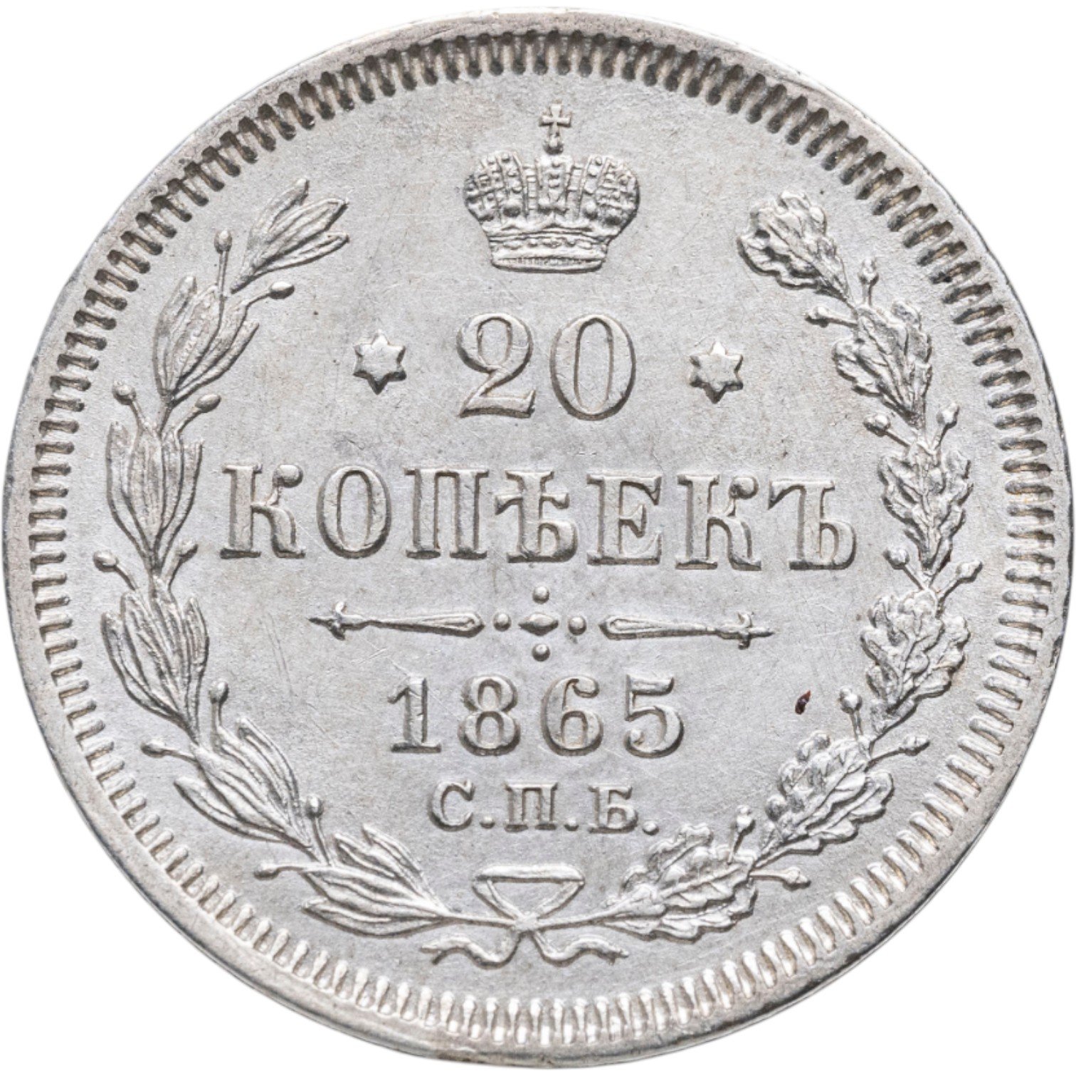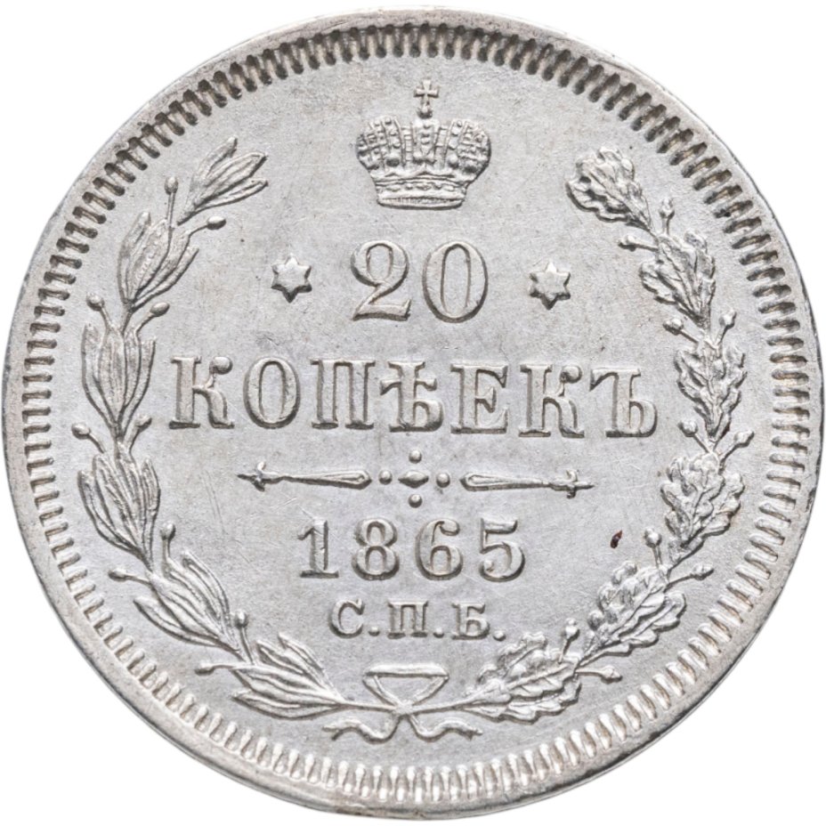 В центре указан номинал «20», ограниченный с обеих сторон шестиконечными звездочками. Над цифрой – Корона Российской империи. Под цифрой номинала — слово "КОПЕЕК". Ниже, расположен декоративный разделитель в виде двух разнонаправленных фигурных линий и стилизованным из точек крестом между ними. Под разделителем — дата выпуска монеты «1865». Под цифрой даты — обозначение монетного двора «С.П.Б.». Вдоль канта, не доходя до короны, изображен венок из лавровой и дубовой ветви, которые в нижней части перевязаны лентой на узел бантом. По окружности канта имеются рельефные элементы, выполненные в виде зубцов.