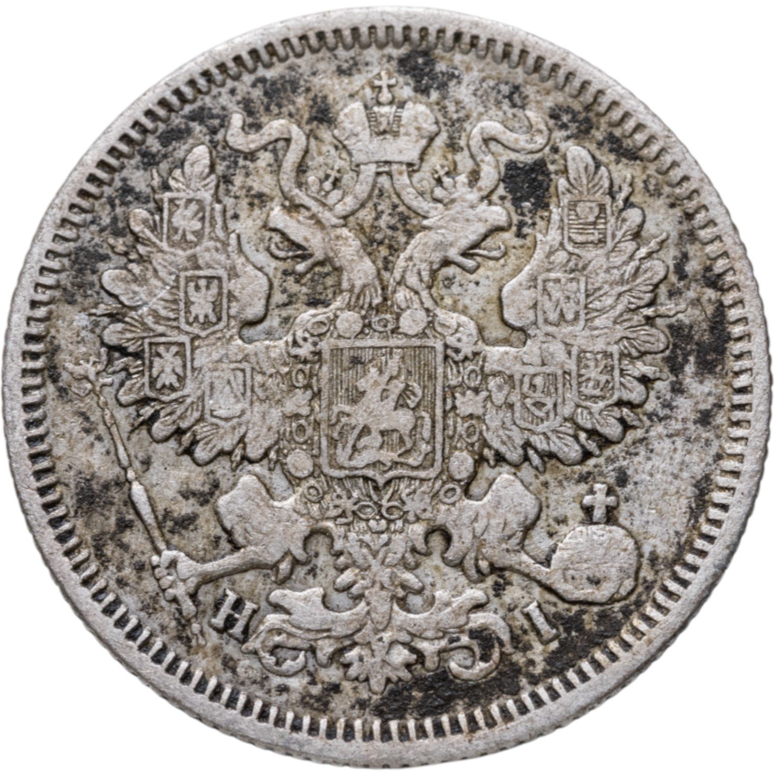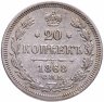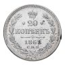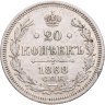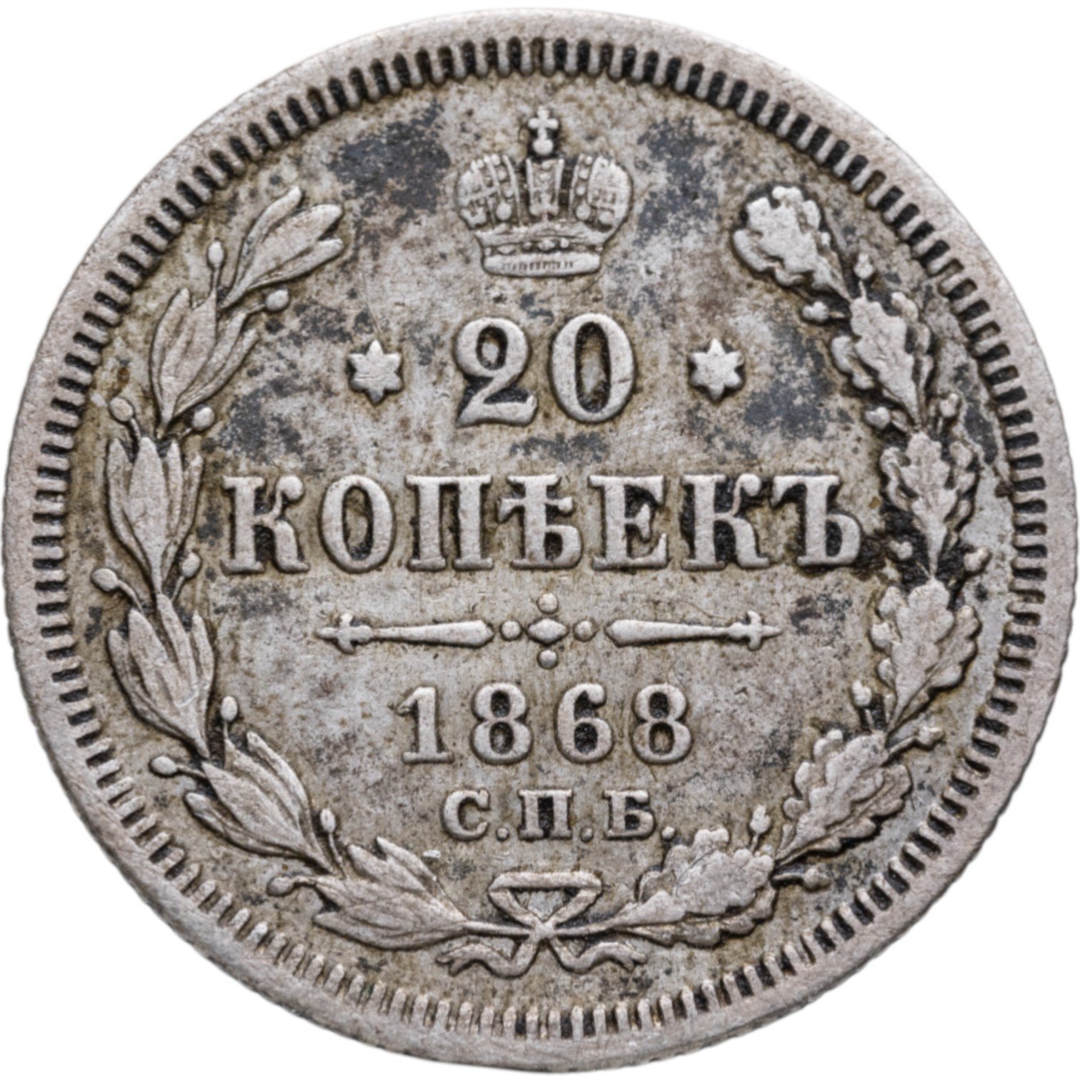 В центре указан номинал - «20», ограниченный с обеих сторон шестиконечными звездочками. Над цифрой – Корона Российской империи. Под цифрой номинала — слово "КОПЕЕК". Ниже, расположен декоративный разделитель в виде двух разнонаправленных фигурных линий и стилизованным из точек крестом между ними. Под разделителем — дата выпуска монеты «1868». Под цифрой даты — обозначение монетного двора «С.П.Б.». Вдоль канта, не доходя до короны, изображен венок из лавровой и дубовой ветви, которые, в нижней части, перевязаны лентой на узел бантом. По окружности канта имеются рельефные элементы, выполненные в виде зубцов.