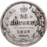 В центре указан номинал - «20», ограниченный с обеих сторон шестиконечными звездочками. Над цифрой – Корона Российской империи. Под цифрой номинала — слово "КОПЕЕК". Ниже, расположен декоративный разделитель в виде двух разнонаправленных фигурных линий и стилизованным из точек крестом между ними. Под разделителем — дата выпуска монеты «1869». Под цифрой даты — обозначение монетного двора «С.П.Б.». Вдоль канта, не доходя до короны, изображен венок из лавровой и дубовой ветви, которые, в нижней части, перевязаны лентой на узел бантом. По окружности канта имеются рельефные элементы, выполненные в виде зубцов.