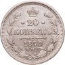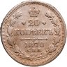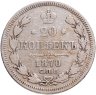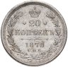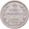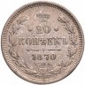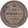 В центре указан номинал - «20», ограниченный с обеих сторон шестиконечными звездочками. Над цифрой – Корона Российской империи. Под цифрой номинала — слово "КОПЕЕК". Ниже, расположен декоративный разделитель в виде двух разнонаправленных фигурных линий и стилизованным из точек крестом между ними. Под разделителем — дата выпуска монеты «1870». Под цифрой даты — обозначение монетного двора «С.П.Б.». Вдоль канта, не доходя до короны, изображен венок из лавровой и дубовой ветви, которые, в нижней части, перевязаны лентой на узел бантом. По окружности канта имеются рельефные элементы, выполненные в виде зубцов.