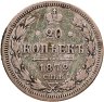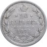 В центре указан номинал - «20», ограниченный с обеих сторон шестиконечными звездочками. Над цифрой – Корона Российской империи. Под цифрой номинала — слово "КОПЕЕК". Ниже, расположен декоративный разделитель в виде двух разнонаправленных фигурных линий и стилизованным из точек крестом между ними. Под разделителем — дата выпуска монеты «1872». Под цифрой даты — обозначение монетного двора «С.П.Б.». Вдоль канта, не доходя до короны, изображен венок из лавровой и дубовой ветви, которые, в нижней части, перевязаны лентой на узел бантом. По окружности канта имеются рельефные элементы, выполненные в виде зубцов.