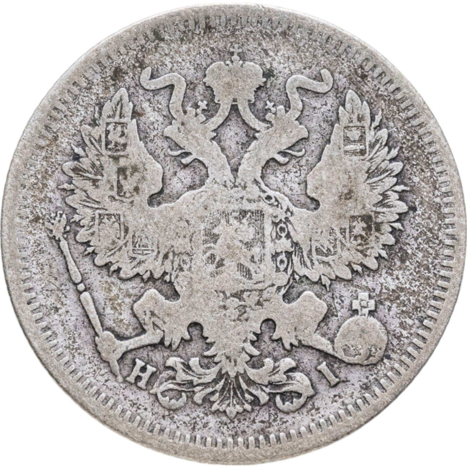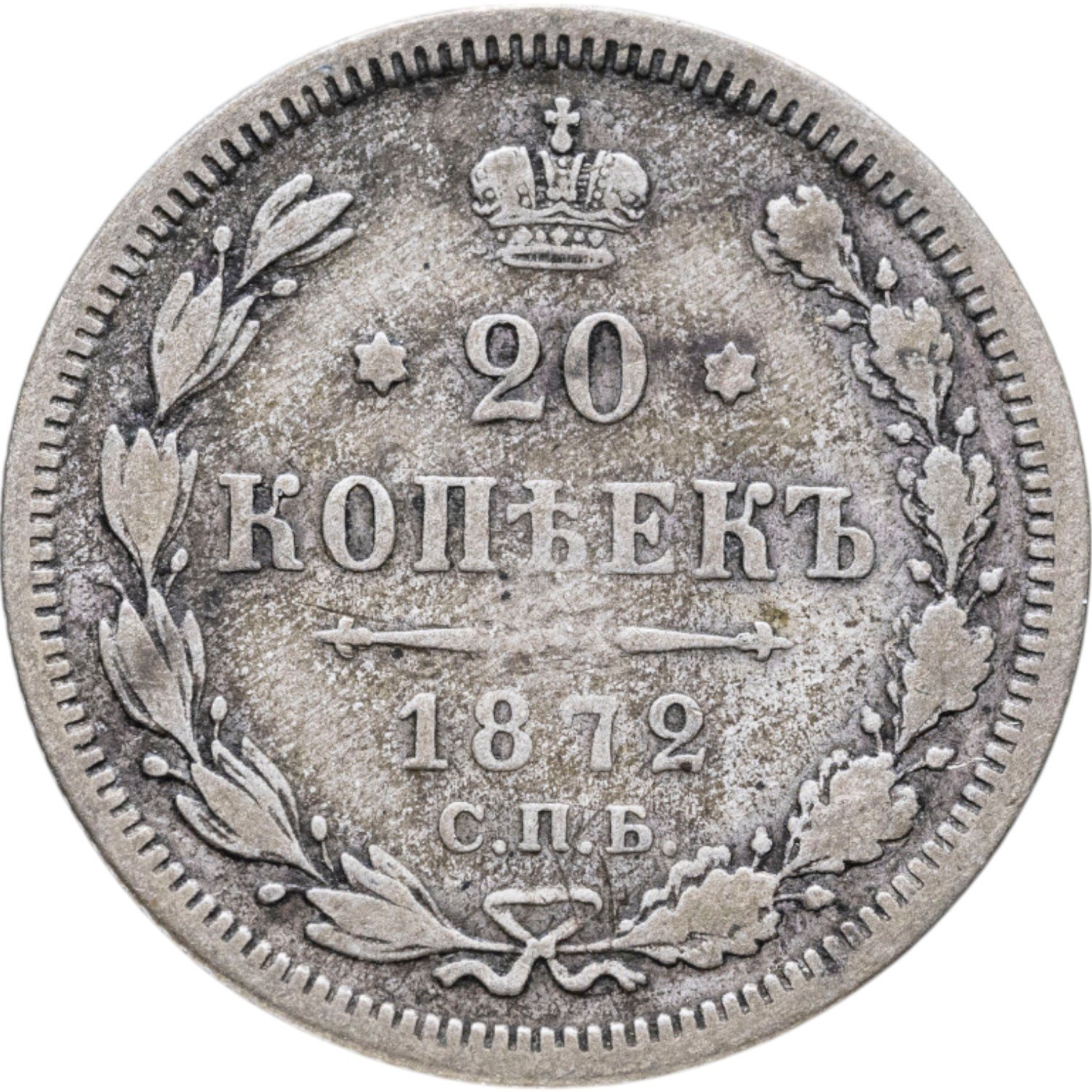 В центре указан номинал - «20», ограниченный с обеих сторон шестиконечными звездочками. Над цифрой – Корона Российской империи. Под цифрой номинала — слово "КОПЕЕК". Ниже, расположен декоративный разделитель в виде двух разнонаправленных фигурных линий и стилизованным из точек крестом между ними. Под разделителем — дата выпуска монеты «1872». Под цифрой даты — обозначение монетного двора «С.П.Б.». Вдоль канта, не доходя до короны, изображен венок из лавровой и дубовой ветви, которые, в нижней части, перевязаны лентой на узел бантом. По окружности канта имеются рельефные элементы, выполненные в виде зубцов.