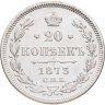 В центре указан номинал - «20», ограниченный с обеих сторон шестиконечными звездочками. Над цифрой – Корона Российской империи. Под цифрой номинала — слово "КОПЕЕК". Ниже, расположен декоративный разделитель в виде двух разнонаправленных фигурных линий и стилизованным из точек крестом между ними. Под разделителем — дата выпуска монеты «1873». Под цифрой даты — обозначение монетного двора «С.П.Б.». Вдоль канта, не доходя до короны, изображен венок из лавровой и дубовой ветви, которые, в нижней части, перевязаны лентой на узел бантом. По окружности канта имеются рельефные элементы, выполненные в виде зубцов.