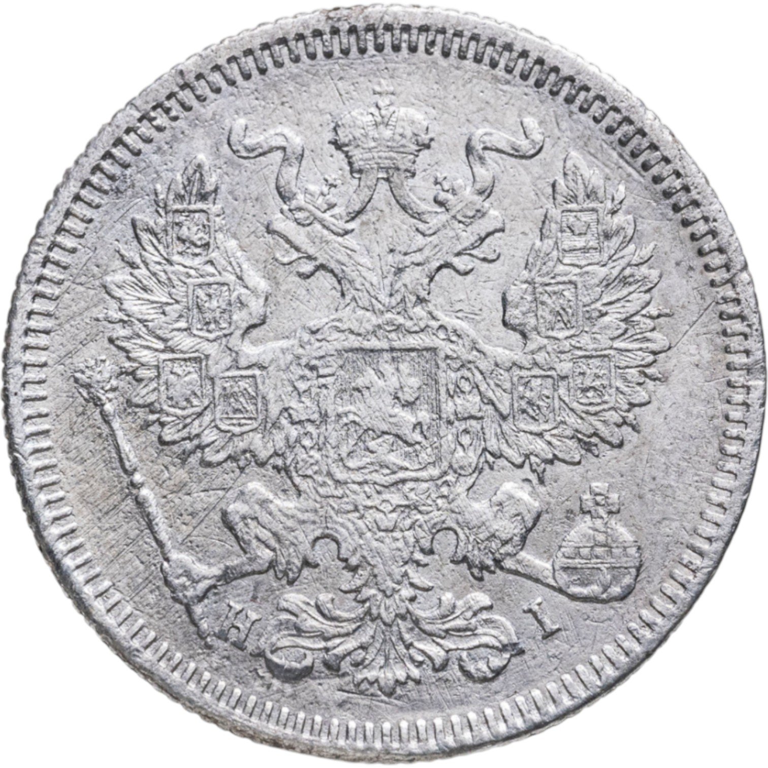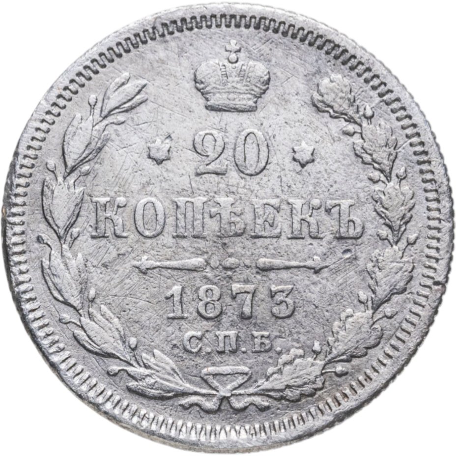 В центре указан номинал - «20», ограниченный с обеих сторон шестиконечными звездочками. Над цифрой – Корона Российской империи. Под цифрой номинала — слово "КОПЕЕК". Ниже, расположен декоративный разделитель в виде двух разнонаправленных фигурных линий и стилизованным из точек крестом между ними. Под разделителем — дата выпуска монеты «1873». Под цифрой даты — обозначение монетного двора «С.П.Б.». Вдоль канта, не доходя до короны, изображен венок из лавровой и дубовой ветви, которые, в нижней части, перевязаны лентой на узел бантом. По окружности канта имеются рельефные элементы, выполненные в виде зубцов.