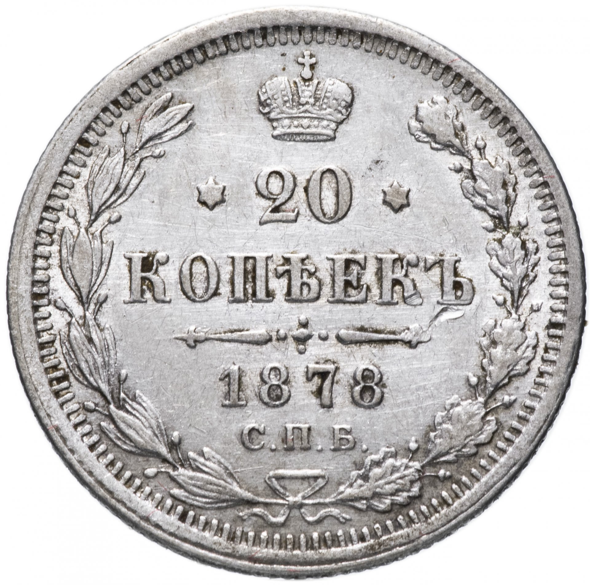 В центре указан номинал - «20», ограниченный с обеих сторон шестиконечными звездочками. Над цифрой – Корона Российской империи. Под цифрой номинала — слово "КОПЕЕК". Ниже, расположен декоративный разделитель в виде двух разнонаправленных фигурных линий и стилизованным из точек крестом между ними. Под разделителем — дата выпуска монеты «1878». Под цифрой даты — обозначение монетного двора «С.П.Б.». Вдоль канта, не доходя до короны, изображен венок из лавровой и дубовой ветви, которые, в нижней части, перевязаны лентой на узел бантом. По окружности канта имеются рельефные элементы, выполненные в виде зубцов.