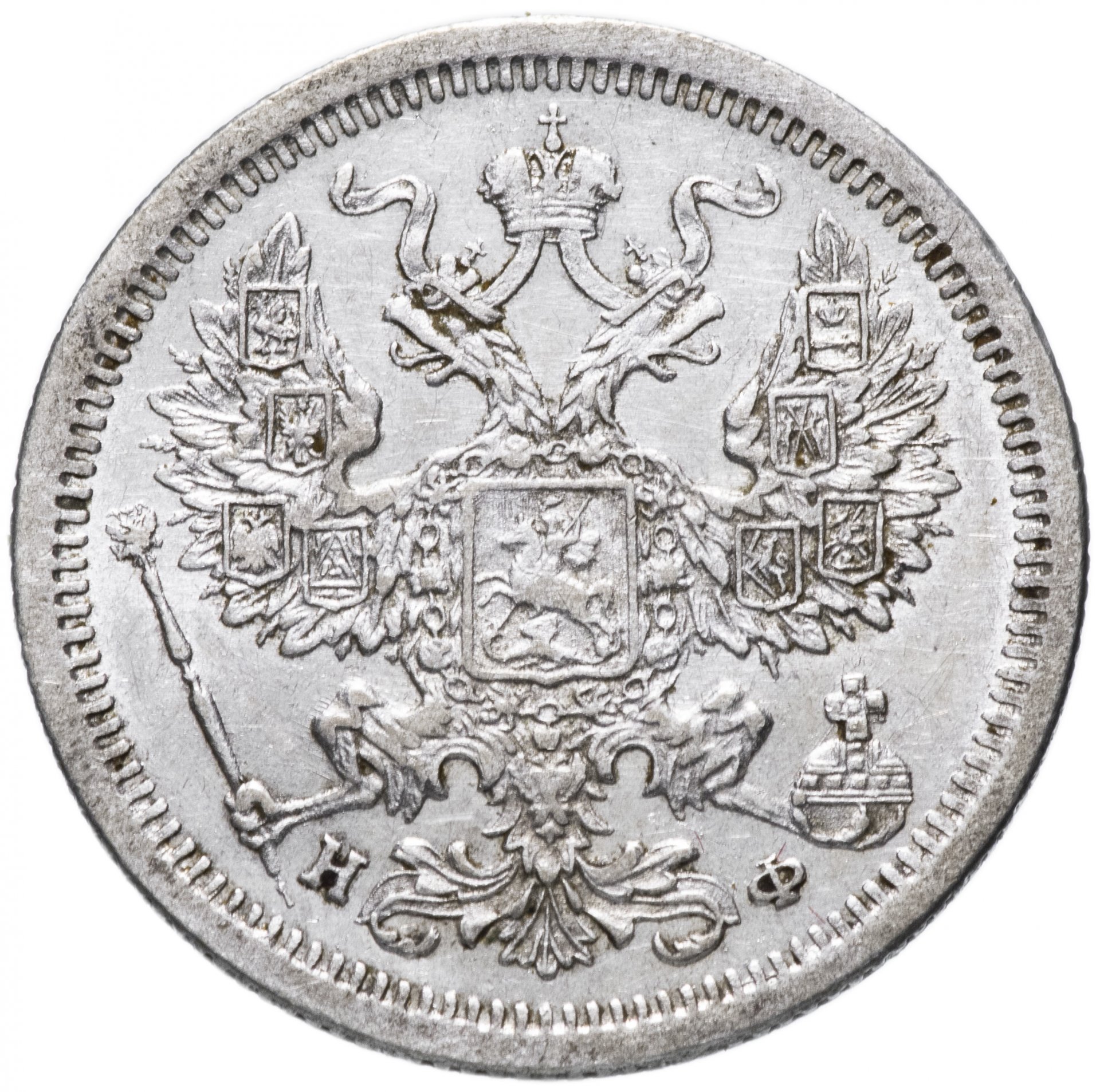 В центре изображен Малый Государственный Герб Российской империи - двуглавый орёл, головы которого увенчаны двумя коронами, третья, большая корона над ними. Все они соединены орденской лентой ордена Св. Апостола Андрея Первозванного. На груди орла расположен Московский герб - щит с изображением Георгия Победоносца, поражающего копьем дракона. Вокруг щита цепь ордена Св. Апостола Андрея Первозванного. На крыльях изображены гербы: Царства Казанского, Польского, Херсонеса Таврического, Астраханского, Сибирского, Грузинского и герб соединенных княжеств Киевского, Новгородского и Владимирского — по 4 на каждое крыло. В правой лапе орла – скипетр, в левой – держава. Под правой лапой – буква «Н», под левой – буква «Ф». Инициалы минцмейстера Николая Фоллендорфа. По окружности канта имеются рельефные элементы, выполненные в виде зубцов.