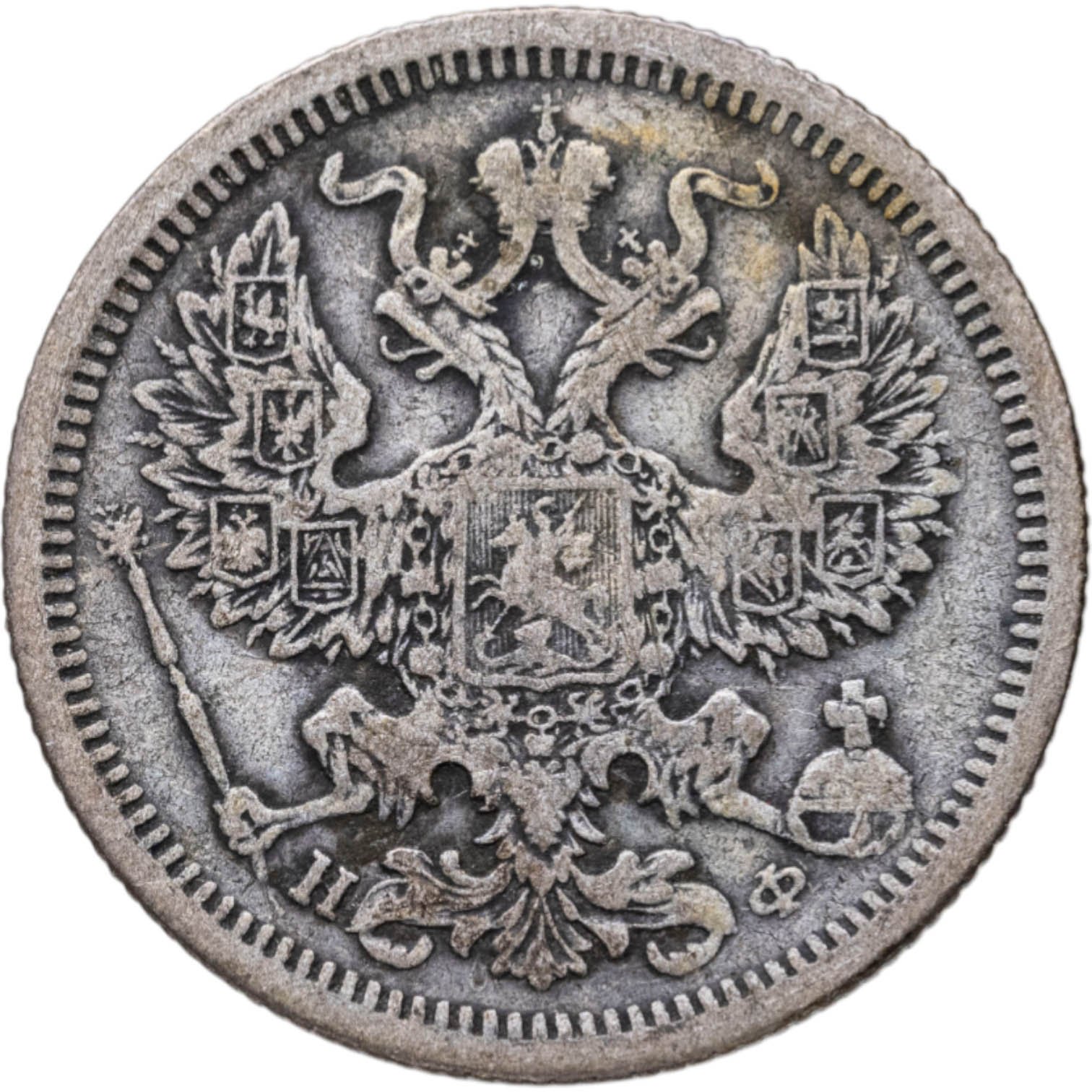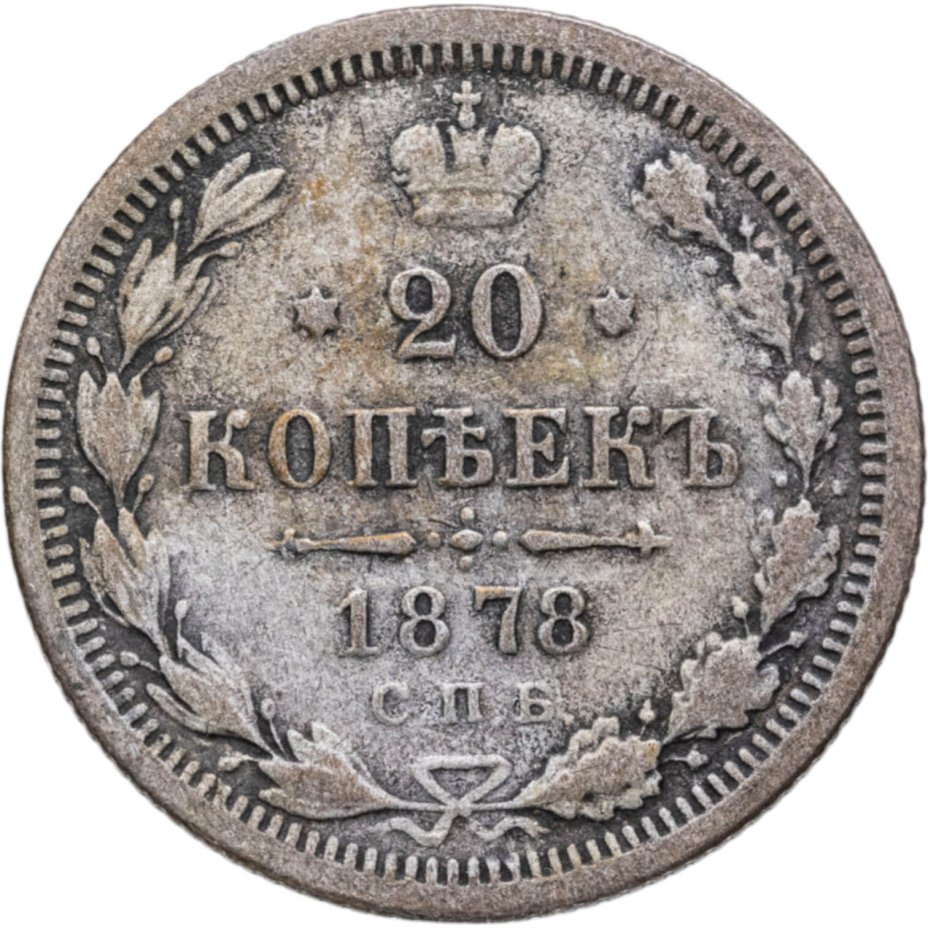 В центре указан номинал - «20», ограниченный с обеих сторон шестиконечными звездочками. Над цифрой – Корона Российской империи. Под цифрой номинала — слово "КОПЕЕК". Ниже, расположен декоративный разделитель в виде двух разнонаправленных фигурных линий и стилизованным из точек крестом между ними. Под разделителем — дата выпуска монеты «1878». Под цифрой даты — обозначение монетного двора «С.П.Б.». Вдоль канта, не доходя до короны, изображен венок из лавровой и дубовой ветви, которые, в нижней части, перевязаны лентой на узел бантом. По окружности канта имеются рельефные элементы, выполненные в виде зубцов.