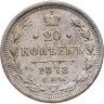 В центре указан номинал - «20», ограниченный с обеих сторон шестиконечными звездочками. Над цифрой – Корона Российской империи. Под цифрой номинала — слово "КОПЕЕК". Ниже, расположен декоративный разделитель в виде двух разнонаправленных фигурных линий и стилизованным из точек крестом между ними. Под разделителем — дата выпуска монеты «1878». Под цифрой даты — обозначение монетного двора «С.П.Б.». Вдоль канта, не доходя до короны, изображен венок из лавровой и дубовой ветви, которые, в нижней части, перевязаны лентой на узел бантом. По окружности канта имеются рельефные элементы, выполненные в виде зубцов.