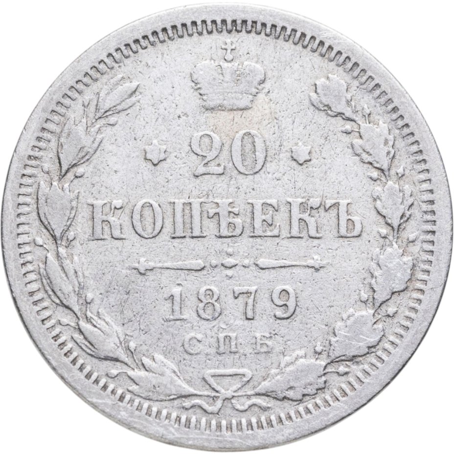 В центре указан номинал - «20», ограниченный с обеих сторон шестиконечными звездочками. Над цифрой – Корона Российской империи. Под цифрой номинала — слово "КОПЕЕК". Ниже, расположен декоративный разделитель в виде двух разнонаправленных фигурных линий и стилизованным из точек крестом между ними. Под разделителем — дата выпуска монеты «1879». Под цифрой даты — обозначение монетного двора «С.П.Б.». Вдоль канта, не доходя до короны, изображен венок из лавровой и дубовой ветви, которые, в нижней части, перевязаны лентой на узел бантом. По окружности канта имеются рельефные элементы, выполненные в виде зубцов.