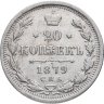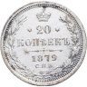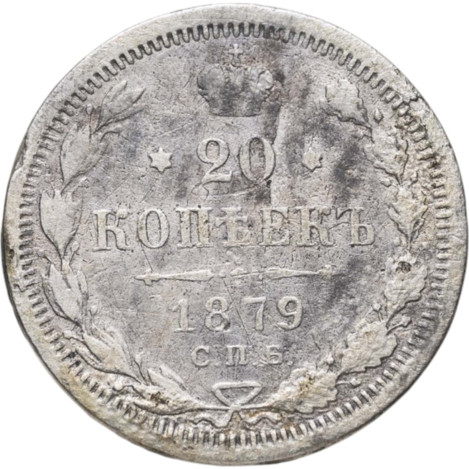 В центре указан номинал - «20», ограниченный с обеих сторон шестиконечными звездочками. Над цифрой – Корона Российской империи. Под цифрой номинала — слово "КОПЕЕК". Ниже, расположен декоративный разделитель в виде двух разнонаправленных фигурных линий и стилизованным из точек крестом между ними. Под разделителем — дата выпуска монеты «1879». Под цифрой даты — обозначение монетного двора «С.П.Б.». Вдоль канта, не доходя до короны, изображен венок из лавровой и дубовой ветви, которые, в нижней части, перевязаны лентой на узел бантом. По окружности канта имеются рельефные элементы, выполненные в виде зубцов.