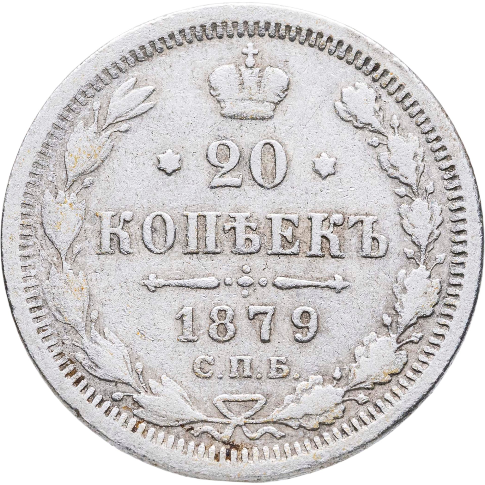 В центре указан номинал - «20», ограниченный с обеих сторон шестиконечными звездочками. Над цифрой – Корона Российской империи. Под цифрой номинала — слово "КОПЕЕК". Ниже, расположен декоративный разделитель в виде двух разнонаправленных фигурных линий и стилизованным из точек крестом между ними. Под разделителем — дата выпуска монеты «1879». Под цифрой даты — обозначение монетного двора «С.П.Б.». Вдоль канта, не доходя до короны, изображен венок из лавровой и дубовой ветви, которые, в нижней части, перевязаны лентой на узел бантом. По окружности канта имеются рельефные элементы, выполненные в виде зубцов.