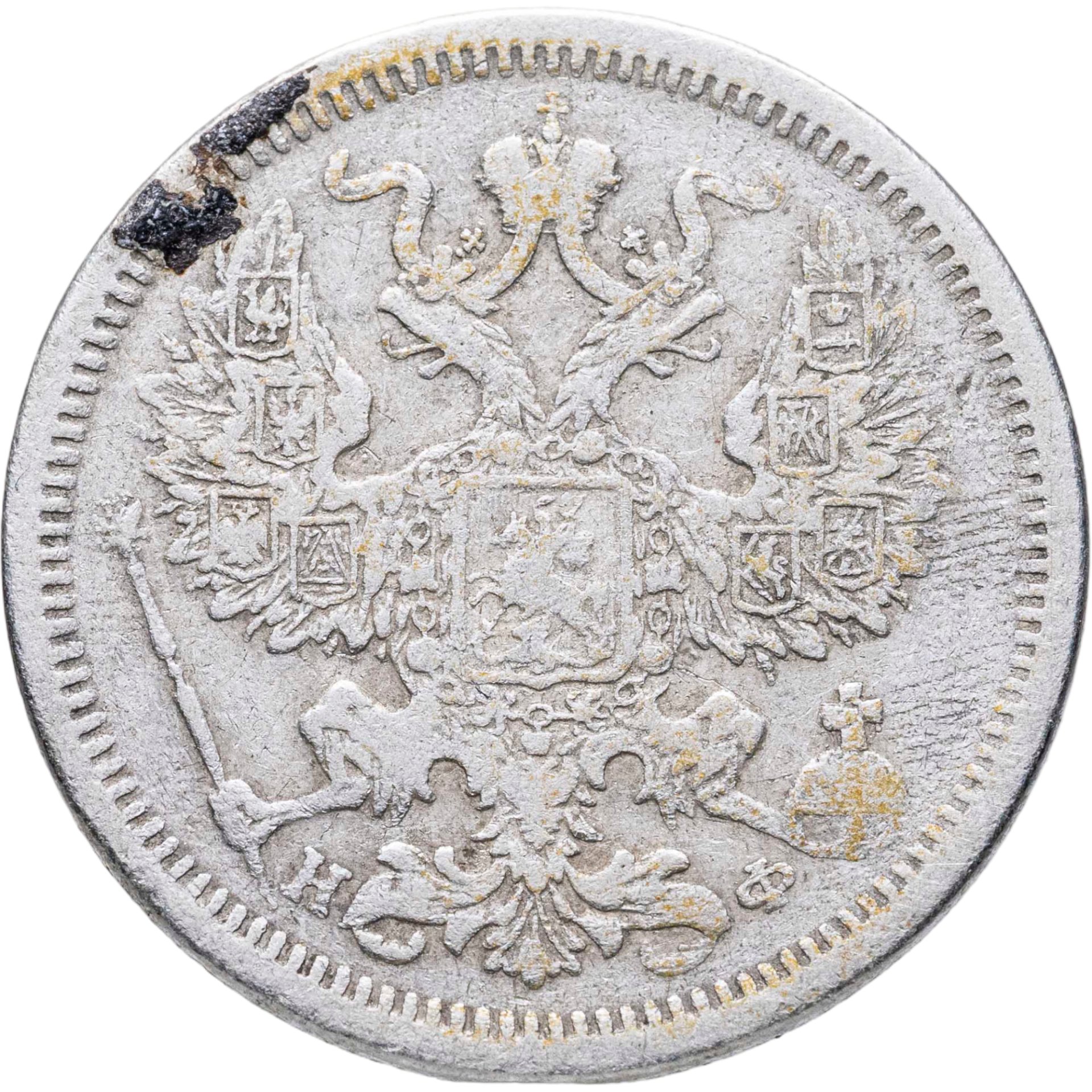 В центре изображен Малый Государственный Герб Российской империи - двуглавый орёл, головы которого увенчаны двумя коронами, третья, большая корона над ними. Все они соединены орденской лентой ордена Св. Апостола Андрея Первозванного. На груди орла расположен Московский герб - щит с изображением Георгия Победоносца, поражающего копьем дракона. Вокруг щита цепь ордена Св. Апостола Андрея Первозванного. На крыльях изображены гербы: Царства Казанского, Польского, Херсонеса Таврического, Астраханского, Сибирского, Грузинского и герб соединенных княжеств Киевского, Новгородского и Владимирского — по 4 на каждое крыло. В правой лапе орла – скипетр, в левой – держава. Под правой лапой – буква «Н», под левой – буква «Ф». Инициалы минцмейстера Николая Фоллендорфа. По окружности канта имеются рельефные элементы, выполненные в виде зубцов.