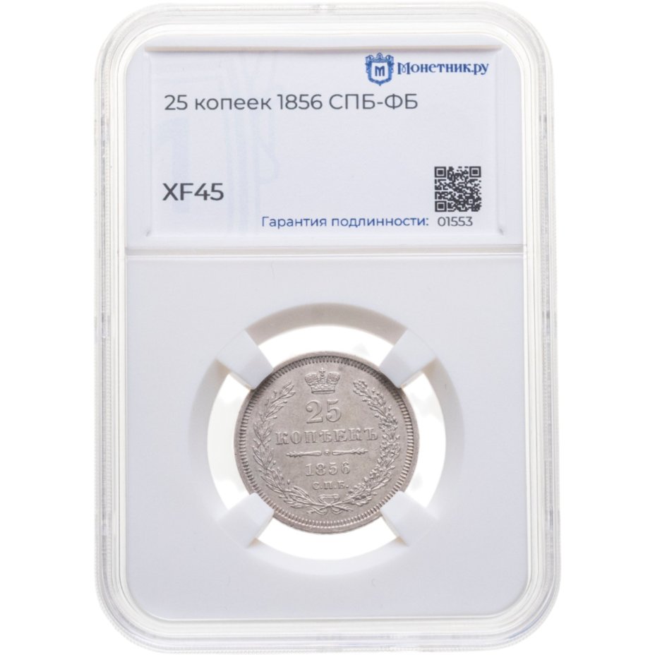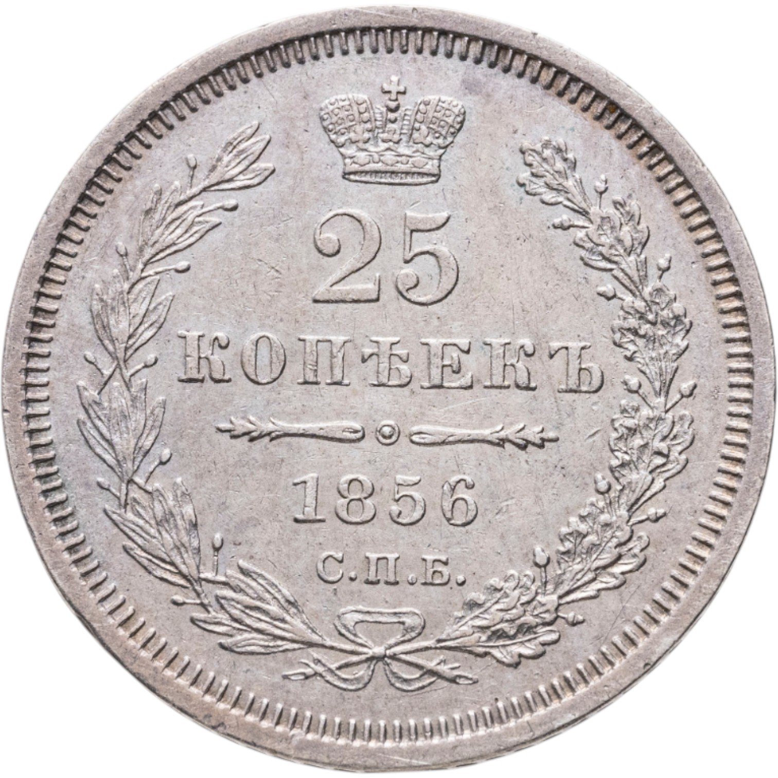 В центре указан номинал «25». Над цифрой – Корона Российской империи. Под цифрой номинала — слово "КОПЕЕК". Ниже, расположен декоративный разделитель в виде двух разнонаправленных фигурных линий и небольшой окружности между ними, в центре которой, выпуклая точка. Под разделителем — дата выпуска монеты «1856». Под цифрой даты — обозначение монетного двора «С.П.Б.». Вдоль канта, не доходя до короны, изображен венок из лавровой и дубовой ветви, которые в нижней части перевязаны лентой на узел бантом. По окружности канта имеются рельефные элементы, выполненные в виде зубцов.