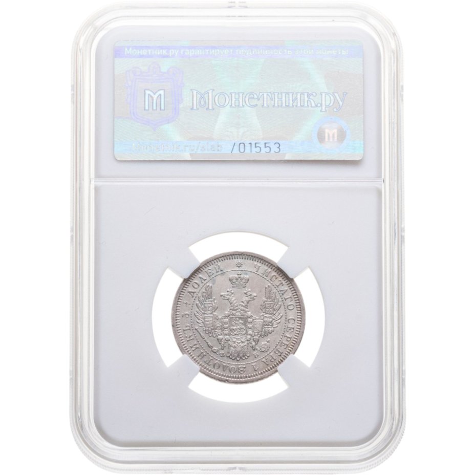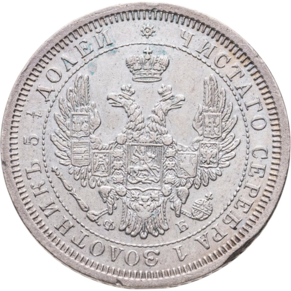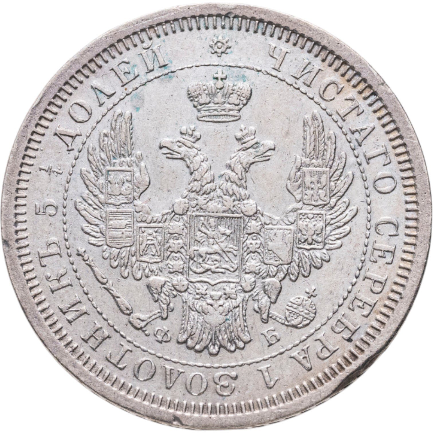 В центре изображен Государственный Герб Российской империи - двуглавый орёл, головы которого увенчаны двумя коронами, третья, большая корона над ними. На груди орла расположен Московский герб, в щите изображен Георгий Победоносец с копьем поражающий дракона. Вокруг щита орденская цепь с орденом Св. Апостола Андрея Первозванного. На крыльях изображены титульные гербы: на правом — Казанский, Астраханский и Сибирский, на левом — Польский, Таврический и Финляндский. В правой лапе орла – скипетр, в левой – держава. Под правой лапой – буква «Ф», под левой – буква «Б». Инициалы минцмейстера Федора Блюма. Центральная часть отделена от остального изображения, окружностью в виде точек. За окружностью круговая надпись: «ЧИСТОГО СЕРЕБРА 1 ЗОЛОТНИК 5 1/4 ДОЛЕЙ», разделенная сверху цветочной розеткой. По окружности канта имеются рельефные элементы, выполненные в виде зубцов.