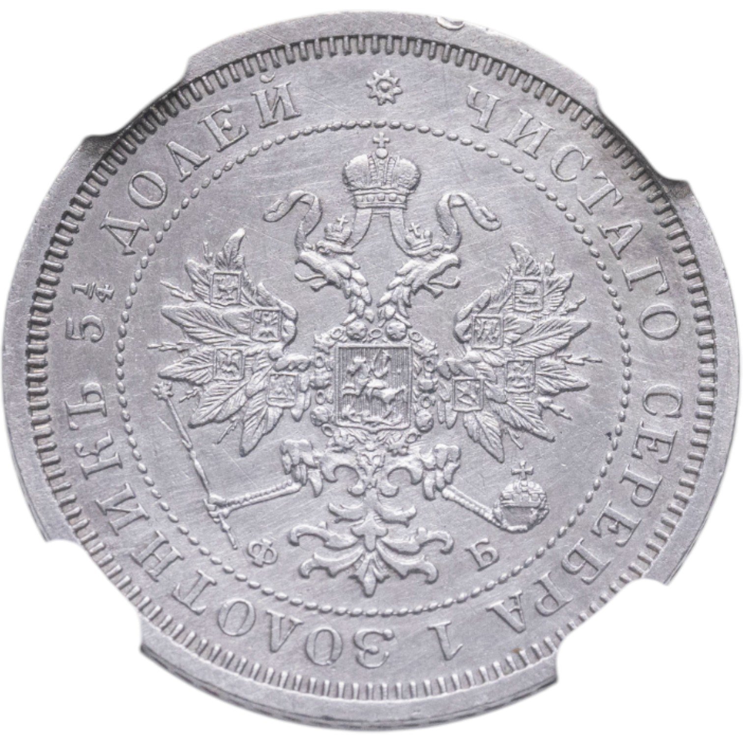 В центре изображен Малый Государственный Герб Российской империи - двуглавый орёл, головы которого увенчаны двумя коронами, третья, большая корона над ними. Все они соединены орденской лентой ордена Св. Апостола Андрея Первозванного. На груди орла расположен Московский герб - щит с изображением Георгия Победоносца с копьём, поражающий дракона. Вокруг щита цепь ордена Св. Апостола Андрея Первозванного. На крыльях изображены гербы: Царства Казанского, Польского, Херсонеса Таврического, Астраханского, Сибирского, Грузинского и герб соединенных княжеств Киевского, Новгородского и Владимирского — по 4 на каждое крыло. В правой лапе орла – скипетр, в левой – держава. Под правой лапой – буква «Ф», под левой – буква «Б». Инициалы минцмейстера Федора Блюма. Центральная часть отделена от остального изображения, окружностью в виде точек. За окружностью круговая надпись: «ЧИСТАГО СЕРЕБРА 1 ЗОЛОТНИК 5 1/4 ДОЛЕЙ», разделенная сверху цветочной розеткой. По окружности канта имеются рельефные элементы, выполненные в виде зубцов.