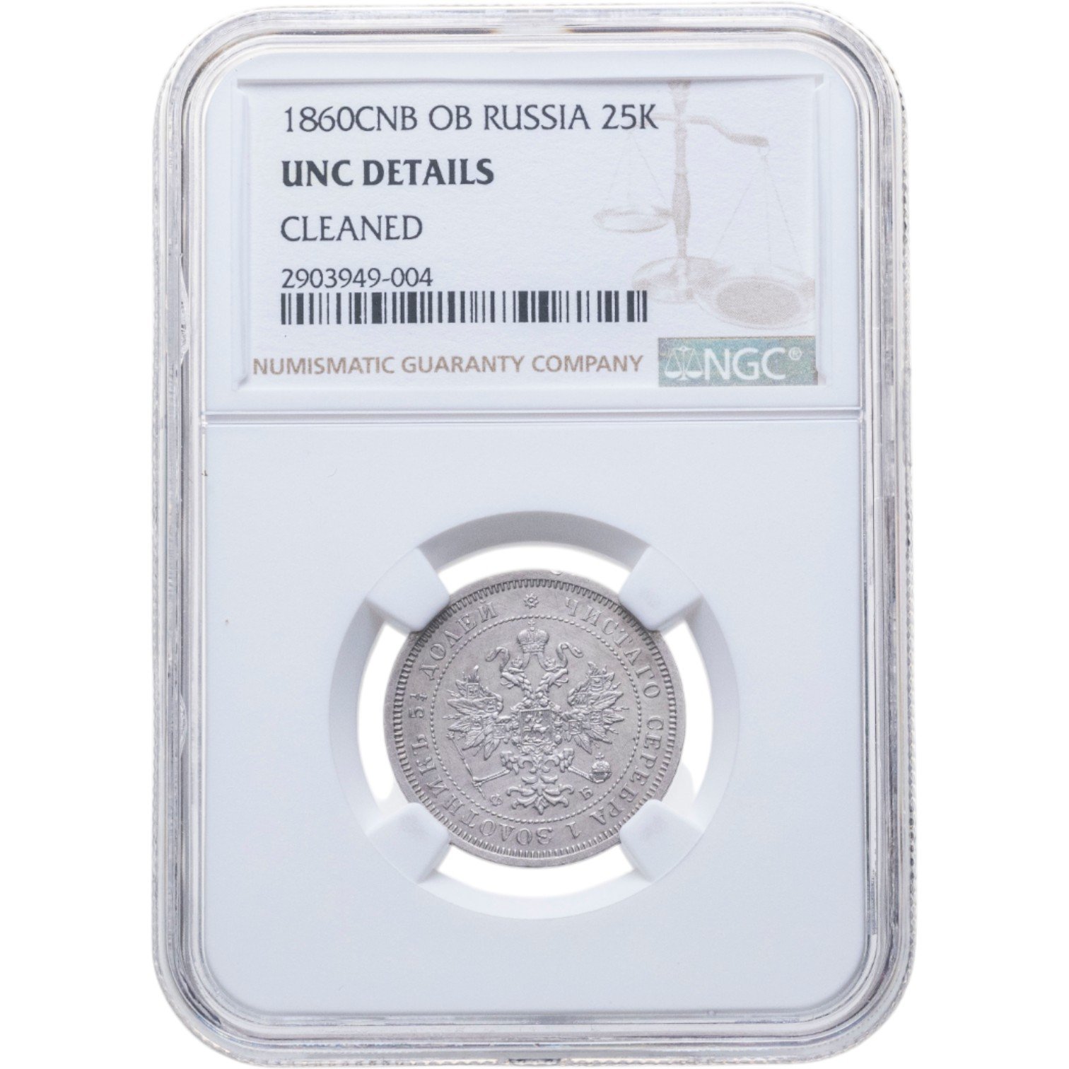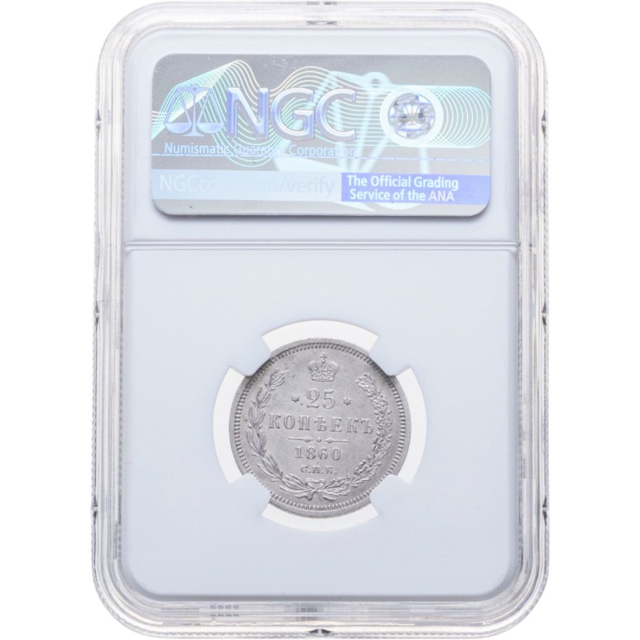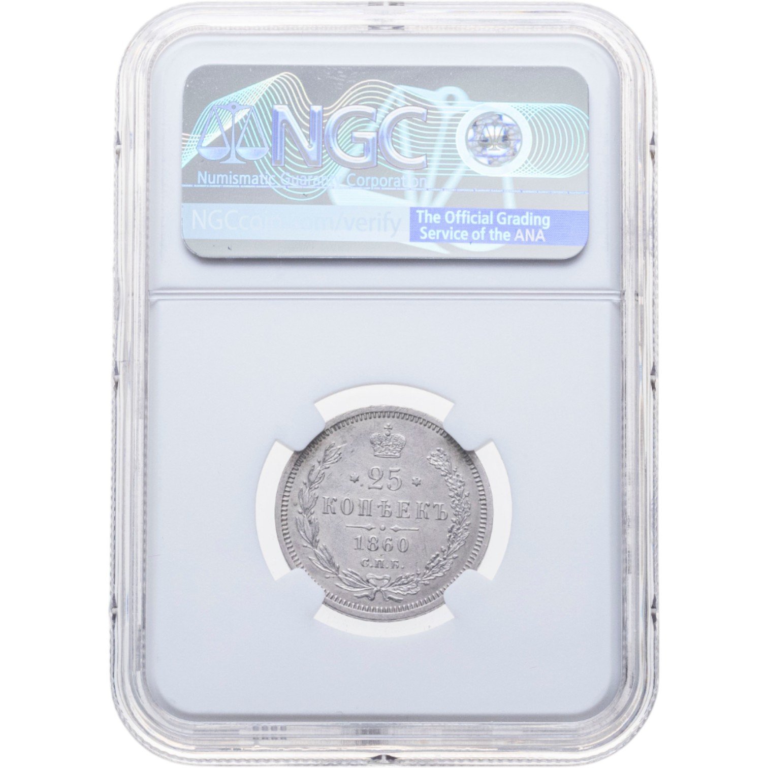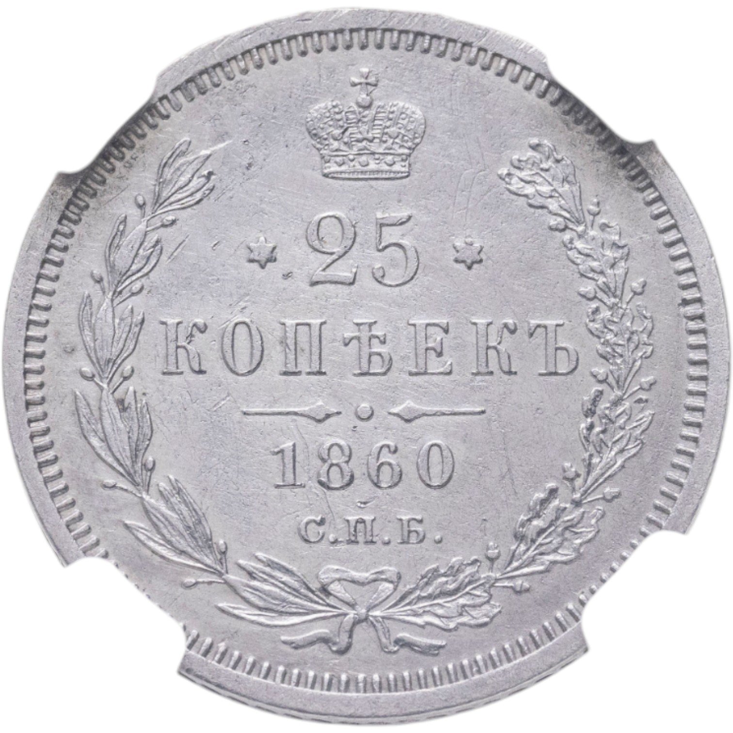 В центре указан номинал - цифра «25», ограниченный с обеих сторон шестиконечными звездочками. Над цифрой – Корона Российской империи. Под цифрой номинала — слово "КОПЕЕК". Ниже, расположен декоративный разделитель в виде двух разнонаправленных фигурных линий и небольшой выпуклой точки между ними. Под разделителем — дата выпуска монеты «1860». Под цифрой даты — обозначение монетного двора «С.П.Б.». Вдоль канта, не доходя до короны, изображен венок из лавровой и дубовой ветви, которые в нижней части перевязаны лентой на узел бантом. По окружности канта имеются рельефные элементы, выполненные в виде зубцов.
