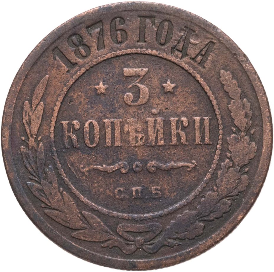 В центре указан номинал «3», ограниченный с обеих сторон звездочками. Под цифрой номинала слово — "КОПЕЙКИ". Ниже, расположен декоративный разделитель в виде двух изогнутых линий и небольшой окружности между ними. Под линиями обозначение монетного двора «С.П.Б.». Центральная часть отделена от остального изображения, окружностью в виде точек. В верхней части по кругу углубленная надпись: "1876 ГОДА". Ниже этой надписи, вдоль канта, изображен венок из лавровой и дубовой ветви, которые в нижней части перевязаны лентой на узел бантом.