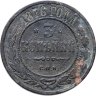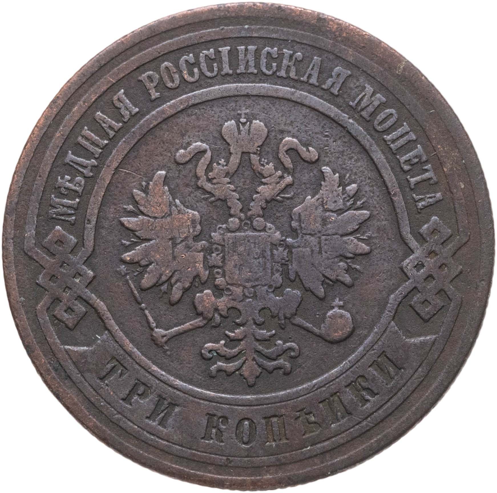 В центре монеты изображен Малый Государственный Герб Российской империи - двуглавый орел, головы которого увенчаны двумя коронами, третья, большая корона над ними. Все они соединены лентой Андрея Первозванного. В правой лапе орла – скипетр, в левой – держава. На его груди расположен Московский герб, в щите изображен Георгий Победоносец с копьем поражающий дракона. Вокруг щита цепь ордена Св. Апостола Андрея Первозванного. На крыльях орла изображены гербы: Царства Казанского, Польского, Херсонеса Таврического, Астраханского, Сибирского, Грузинского и герб соединенных княжеств Киевского, Новгородского и Владимирского — по 4 на каждое крыло. По окружности - две полукруглые плашки, соединенные узорами. На верхней плашке выпуклая надпись: "МЕДНАЯ РОССИЙСКАЯ МОНЕТА". На нижней плашке, изображенной в виде ленты, углубленная надпись: "ТРИ КОПЕЙКИ".