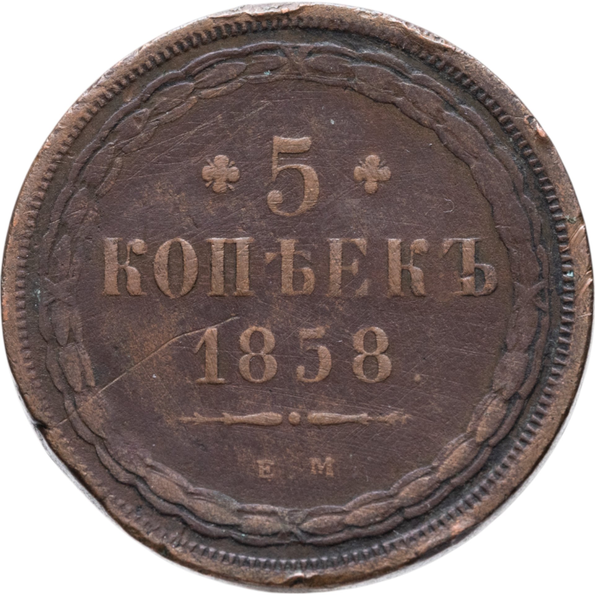 В центре указан номинал «5», ограниченный с обеих сторон цветочными розетками. Под цифрой номинала — слово "КОПЕЕК", под ним год выпуска монеты «1858.». Ниже, расположен декоративный разделитель в виде двух фигурных линий и небольшой точки между ними. Под разделителем обозначение монетного двора «Е.М.».