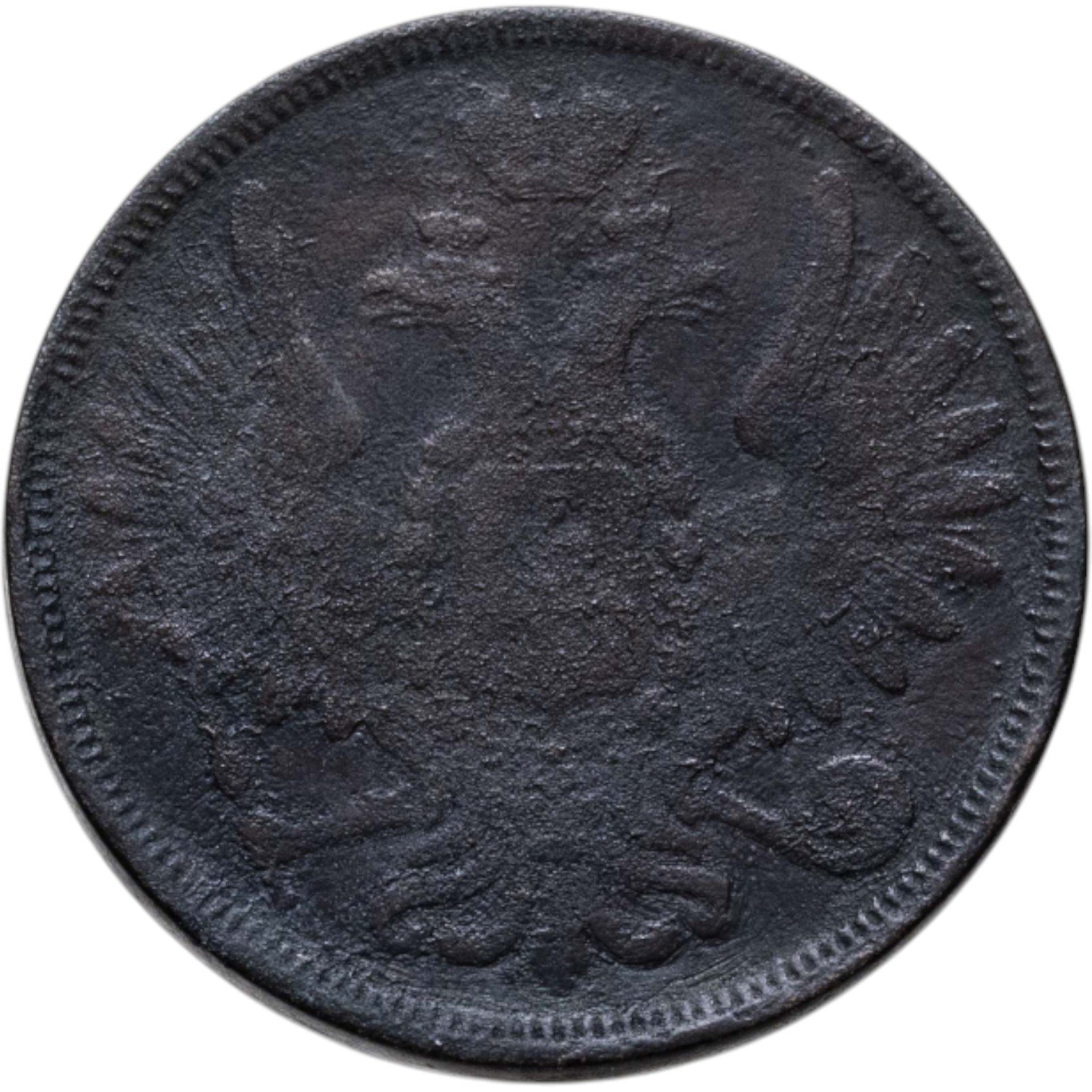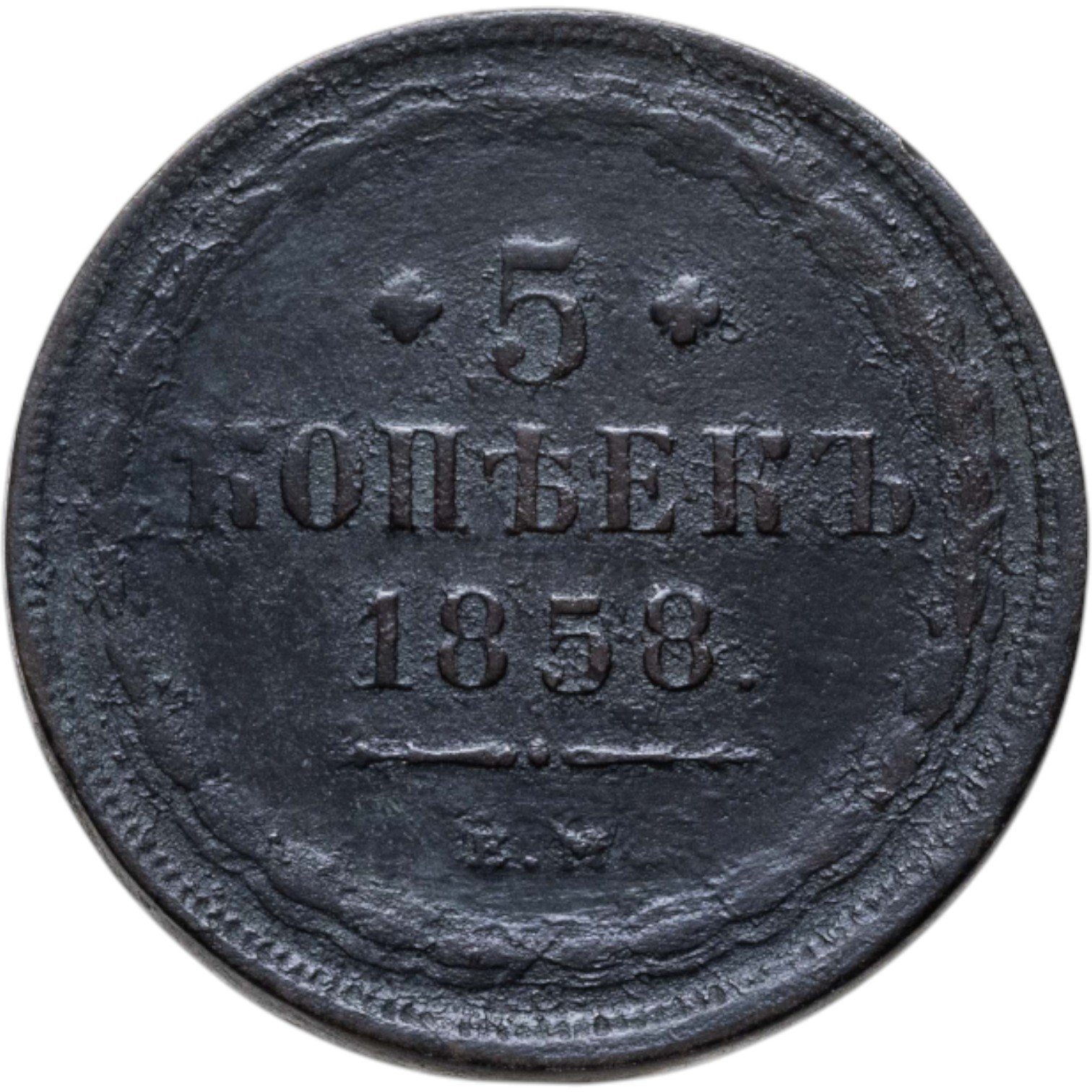 В центре указан номинал «5», ограниченный с обеих сторон цветочными розетками. Под цифрой номинала — слово "КОПЕЕК", под ним год выпуска монеты «1858.». Ниже, расположен декоративный разделитель в виде двух фигурных линий и небольшой точки между ними. Под разделителем обозначение монетного двора «Е.М.».