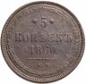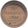 В центре указан номинал «5», ограниченный с обеих сторон цветочными розетками. Под цифрой номинала — слово "КОПЕЕК", под ним год выпуска монеты «1860.». Ниже, расположен декоративный разделитель в виде двух фигурных линий и небольшой точки между ними. Под разделителем обозначение монетного двора «Е.М.».