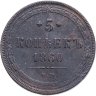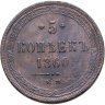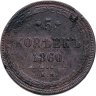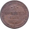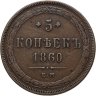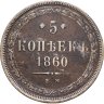 В центре указан номинал «5», ограниченный с обеих сторон цветочными розетками. Под цифрой номинала — слово "КОПЕЕК", под ним год выпуска монеты «1860.». Ниже, расположен декоративный разделитель в виде двух фигурных линий и небольшой точки между ними. Под разделителем обозначение монетного двора «Е.М.».