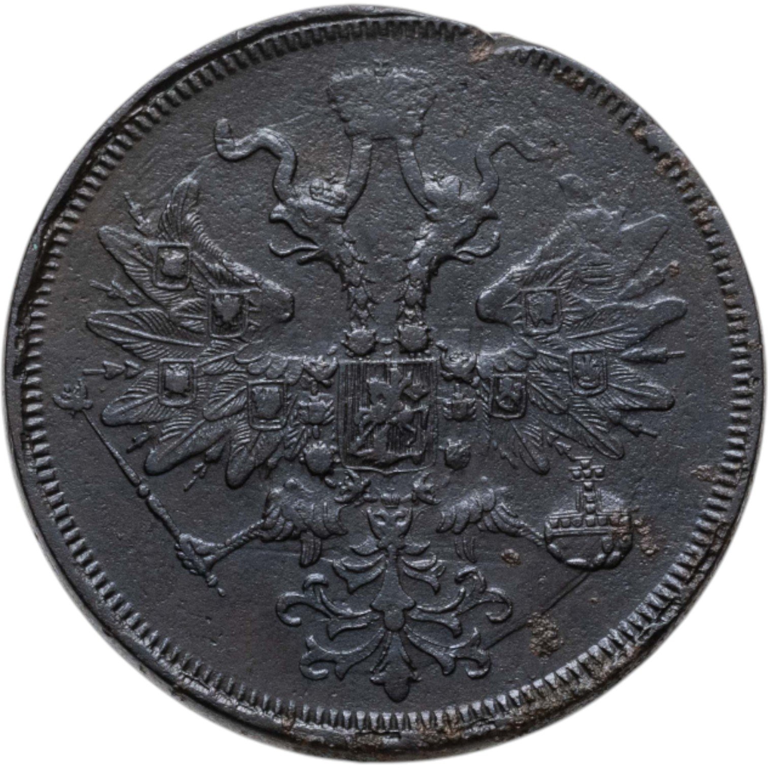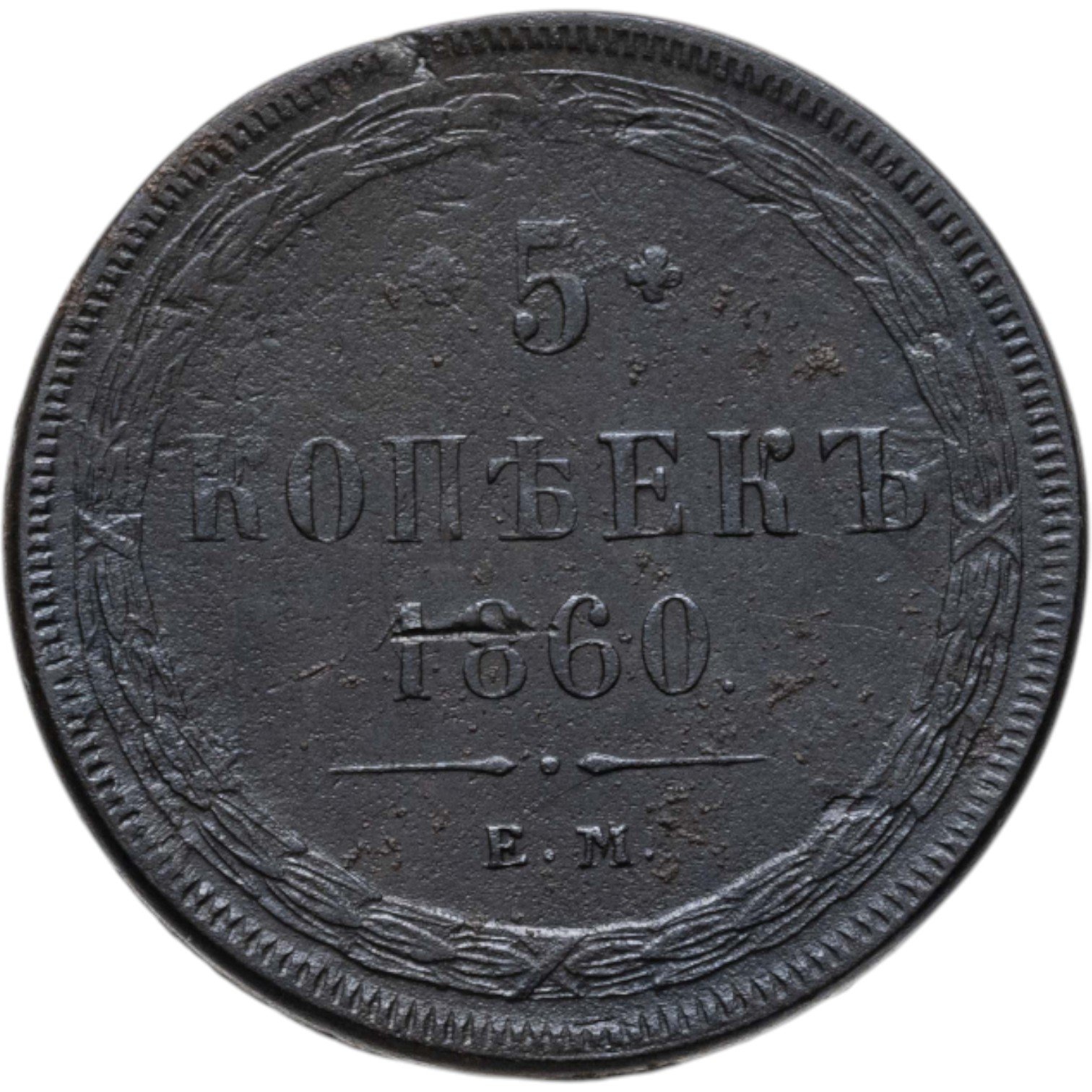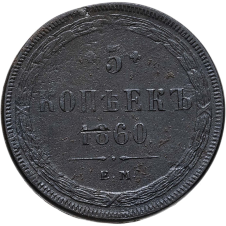 В центре указан номинал «5», ограниченный с обеих сторон цветочными розетками. Под цифрой номинала — слово "КОПЕЕК", под ним год выпуска монеты «1860.». Ниже, расположен декоративный разделитель в виде двух фигурных линий и небольшой точки между ними. Под разделителем обозначение монетного двора «Е.М.».