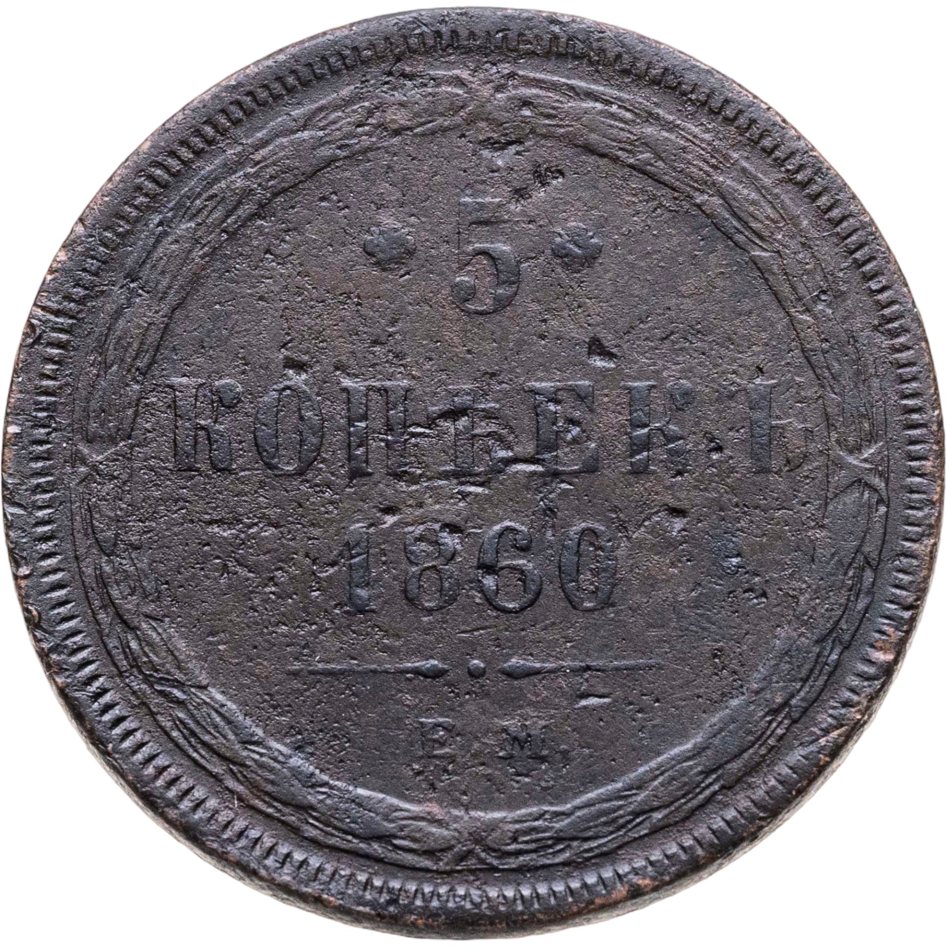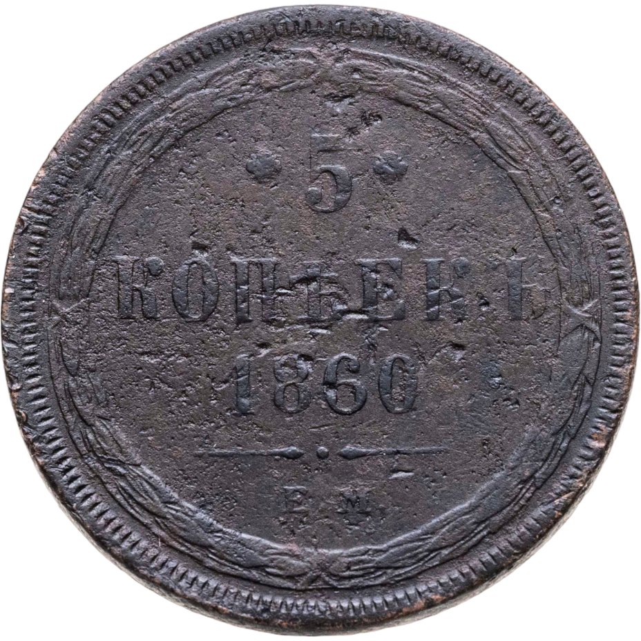 В центре указан номинал «5», ограниченный с обеих сторон цветочными розетками. Под цифрой номинала — слово "КОПЕЕК", под ним год выпуска монеты «1860.». Ниже, расположен декоративный разделитель в виде двух фигурных линий и небольшой точки между ними. Под разделителем обозначение монетного двора «Е.М.».
