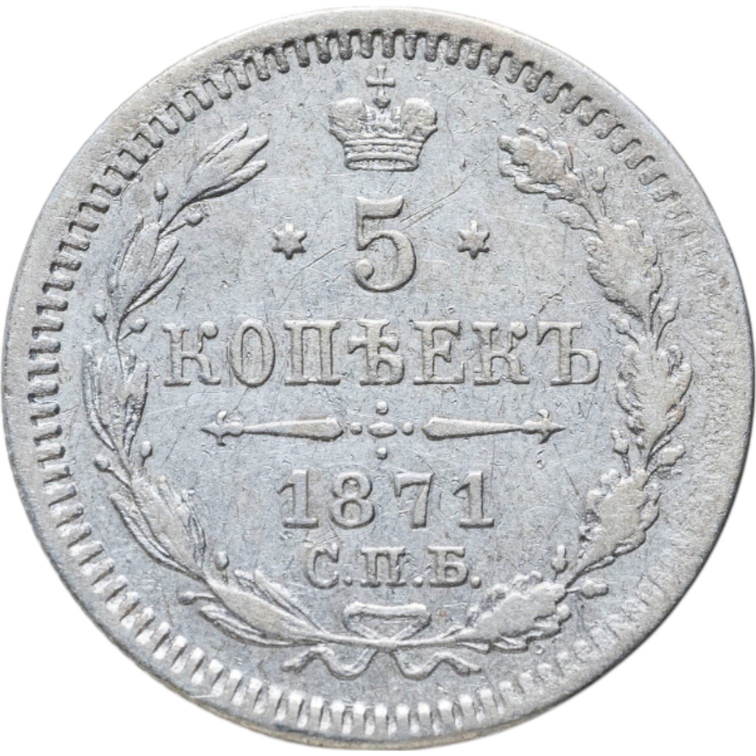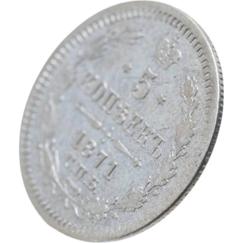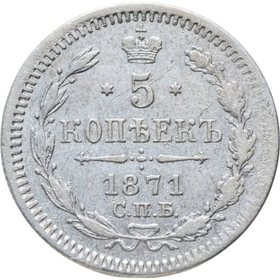 В центре указан номинал - «5», ограниченный с обеих сторон шестиконечными звездочками. Над цифрой – Корона Российской империи. Под цифрой номинала — слово "КОПЕЕК". Ниже, расположен декоративный разделитель в виде двух разнонаправленных фигурных линий и стилизованным из точек крестом между ними. Под разделителем — дата выпуска монеты «1871». Под цифрой даты — обозначение монетного двора «С.П.Б.». Вдоль канта, не доходя до короны, изображен венок из лавровой и дубовой ветви, которые, в нижней части, перевязаны лентой на узел бантом. По окружности канта имеются рельефные элементы, выполненные в виде зубцов.