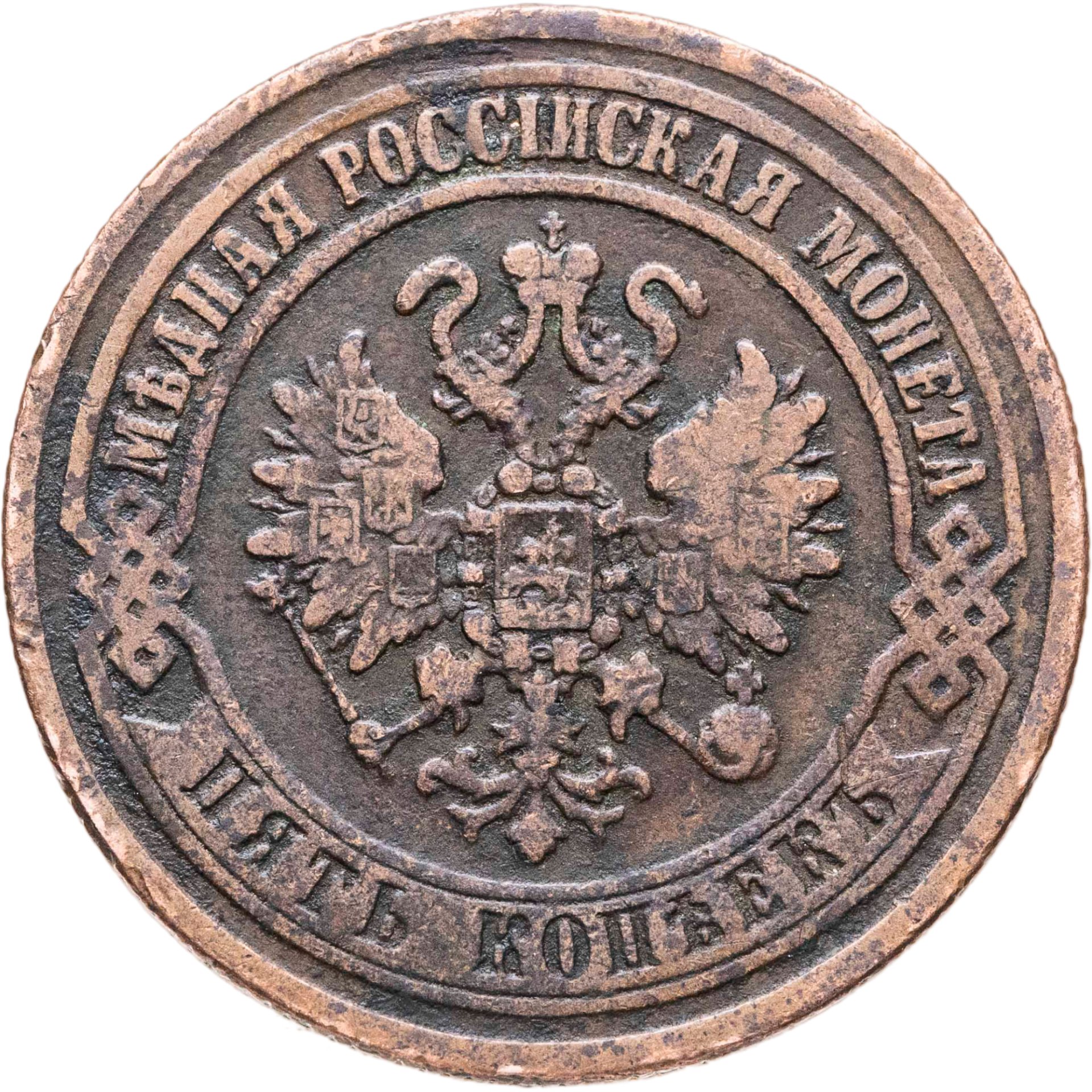 В центре монеты изображен Малый Государственный Герб Российской империи - двуглавый орел, головы которого увенчаны двумя коронами, третья, большая корона над ними. Все они соединены лентой Андрея Первозванного. В правой лапе орла – скипетр, в левой – держава. На его груди расположен Московский герб, в щите изображен Георгий Победоносец с копьем поражающий дракона. Вокруг щита цепь ордена Св. Апостола Андрея Первозванного. На крыльях орла изображены гербы: Царства Казанского, Польского, Херсонеса Таврического, Астраханского, Сибирского, Грузинского и герб соединенных княжеств Киевского, Новгородского и Владимирского — по 4 на каждое крыло. По окружности - две полукруглые плашки, соединенные узорами. На верхней плашке выпуклая надпись: "МЕДНАЯ РОССИЙСКАЯ МОНЕТА". На нижней плашке, изображенной в виде ленты, углубленная надпись: "ПЯТЬ КОПЕЕК".