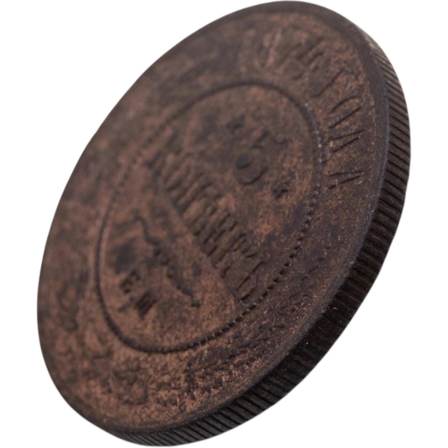 В центре указан номинал «5», ограниченный с обеих сторон звездочками. Под цифрой номинала слово — "КОПЕЕК". Ниже, расположен декоративный разделитель в виде двух изогнутых линий и небольшой окружности между ними. Под линиями обозначение монетного двора «Е.М.». Центральная часть отделена от остального изображения, окружностью в виде точек. В верхней части по кругу углубленная надпись: "1874 ГОДА". Вдоль канта изображен венок из лавровой и дубовой ветви, которые в нижней части перевязаны лентой на узел бантом.